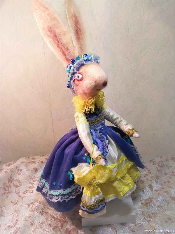 Ну наконец-то и моя красотка собралась. Как же долго она собиралась. Как истинная дама перебрала все ткани, все кружева, все украшения. Весь дом вверх ногами перевернула. Ничего то её не устраивало. Наконец моё терпение лопнуло и я ей заявила, что пока она будет капризничать, у её кавалера терпение тоже кончится и положит он глаз на другую зайку. Она возразила, что истинный джентльмен будет ждать свою даму, столько сколько потребуется, а другой ей не нужен. Но всё таки, стала она поторапливаться. Наряд выбрала, причёску сделала. И опять незадача! Как же в наше время без фотосессии!!!! Целый день ушёл у неё на выбор поз, освещения... Устала. Но вот все хлопоты позади и вот она предстала перед вами. Правда, осталась таки одна незадача. Никак не смогла она себе имя выбрать. Кавалер у неё с французским именем "Вуаля", а какое ей выбрать , чтоб подходило, никак на ум не приходит. Вот такая у нас проблемка.... Итак, сначала фото красотки, а потом рабочие моменты. Высота у нас 32 см., это без ушек.