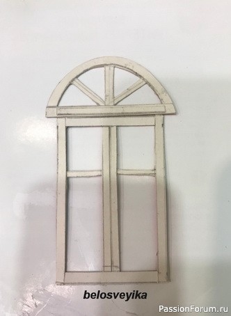 На тонком картоне нарисовала окна нужного мне размера, вырезала. Арка,наверху окна,отдельная деталь.Рамы и арка двойные,то есть проклеила двойными полосками картона.