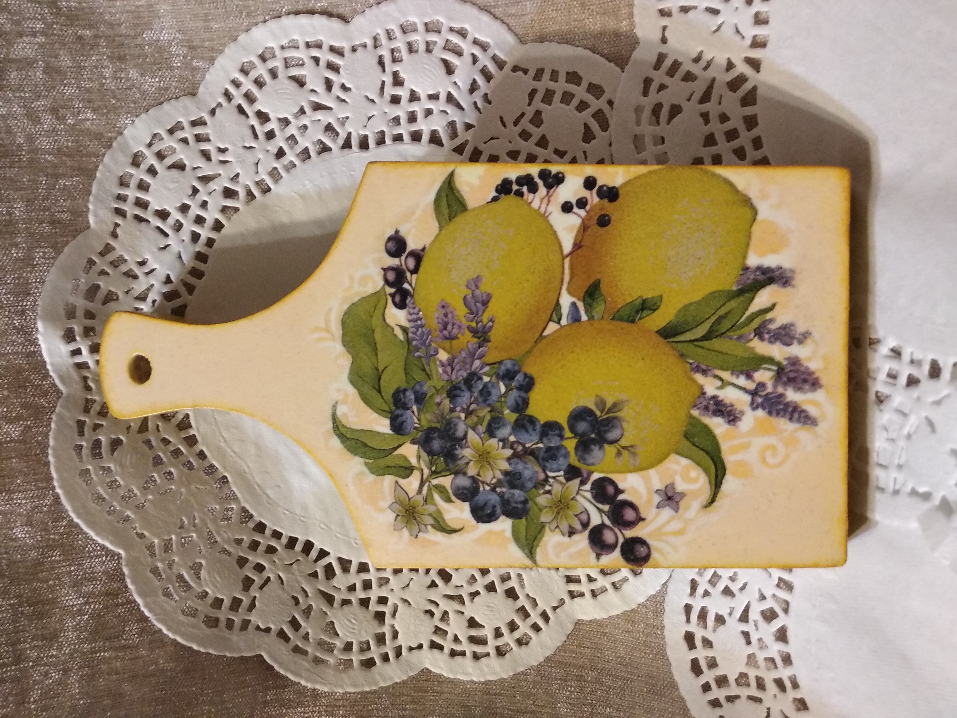 Рада, что доставила тебе удовольствие своими работами… Лимонную тему очень люблю, здорово, что у вас растут лимоны… наверно запах стоит на всю кухню при готовке..., да и так наверно запах лимонов стоит в воздухе...) Однажды была в Ашане, и зашла в отдел салфеток (хотя давала себе обещание, больше не покупать салфеток), но увидев эти очаровательные салфетки с лимонами, забыла, что себе обещала… Купила и сразу родился этот набор, я вообще как-то больше люблю работать салфетками, по душе они мне...
