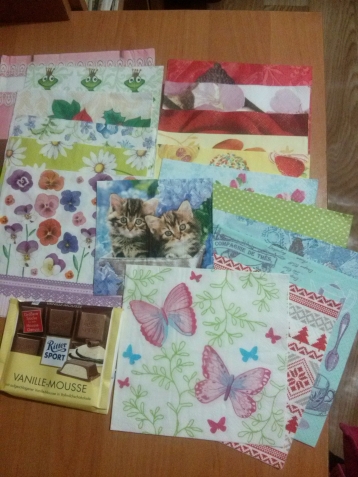 Больше всего меня поразила наша Надежда rossa из Германии. Целая коробка салфеток!!! Я не смогла все вместить в кадр, такое изобилие, что я час пересматривала и радовалась как ребёнок )) Хватит декупажить до конца дней )) Спасибо большое Надюша за твою щедрость...