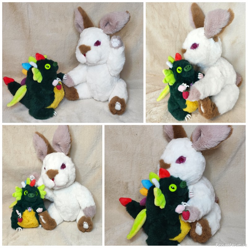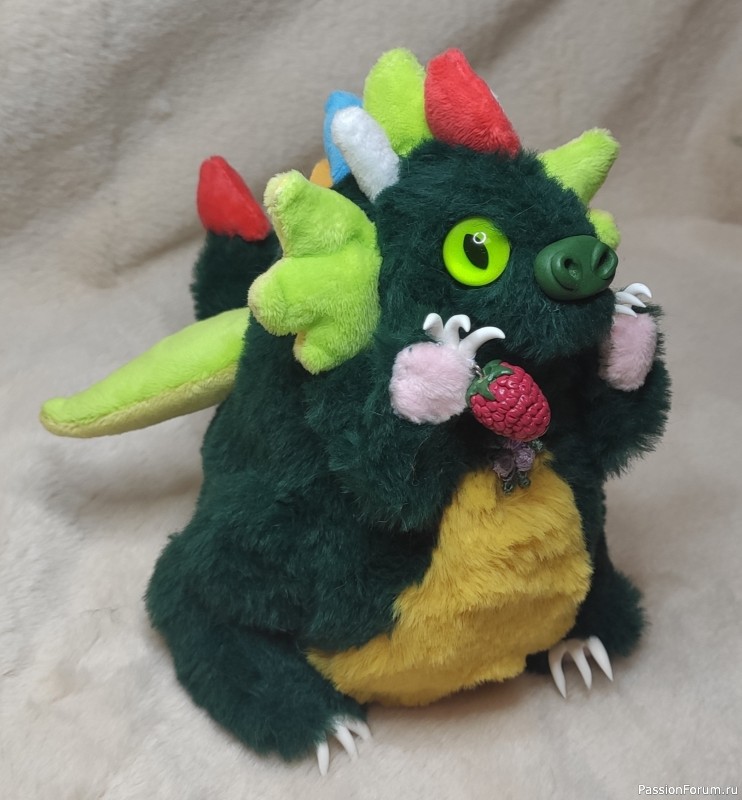 Т.к. выкройку не авторскую - условие, сделала сначала зарисовки, пришла к своей - тело цельнокройное, на голове выточка, пузико вшитое. Нос, когти, ягодка из полимерной глины. Тельце и пузико из искусственного меха, остальные разноцветные"прибамбасики" из плюша. Внутри синтепон. Высота в холке 15см. Глаза кошачьи, готовые купила. Сначала раскроила, сшила всё мелочи и начала собирать - первым делом от носика до хвоста прошила, предварительно прикрепив, как видно на фото, спинные украшения. Затем прошила от носика до отметки на шее и пришила пузо. Следующий шаг - рожки , "ушки", крылья, кончик хвоста , конечности.Конечности на бусинках, глаза посадила и на месте будущего носика пришила маленькую, плоскую пуговку. И начала мудрить с полимерной глиной - нос и когти, готовый нос приклеен на пуговку. Когти, как видно на фото по три вместе и имеют по две дырочки, когти пришли на подошвы лап.