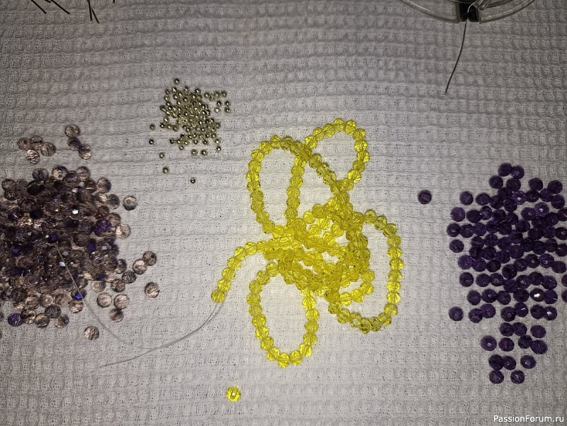 - бусины 3 мм, стекло: жёлтые - 33 шт., сиреневые - 33 шт., серые - 96 шт.;
