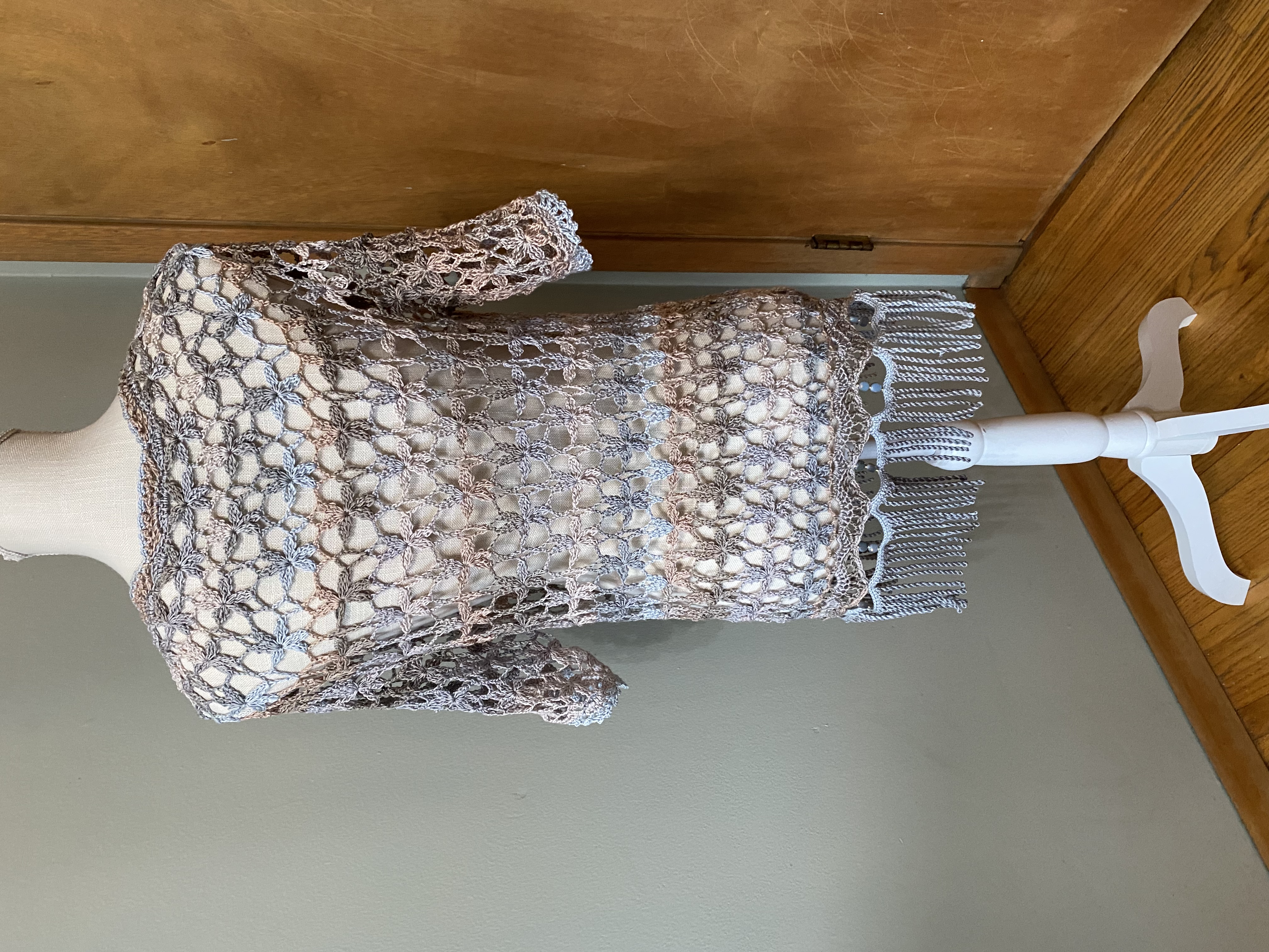Всем доброго дня !На форуме была выставлена работа Валентины шалька с интересным рисунком цветочками.Валентина поделилась уроком на ютюбе ,но там шалька,каждый ряд по бокам прибавление цветочков.Мне очень понравился ажур ,я немного поработала с краем ,что бы пристроить эту схему на кофточку.Немного поигралась с бахромой и стеклярусом по нижнему краю изделия .Вот посмотрите что из этого у меня получилось .Пошло три моточка хлопка по 100 грамм ,320 метров в мотке,крючок 2,75.Вяжется с низу и переходит в кокетку,а затем уже довязывала сверху вниз рукавчики..Не Спасибо за внимание и вашу оценку!