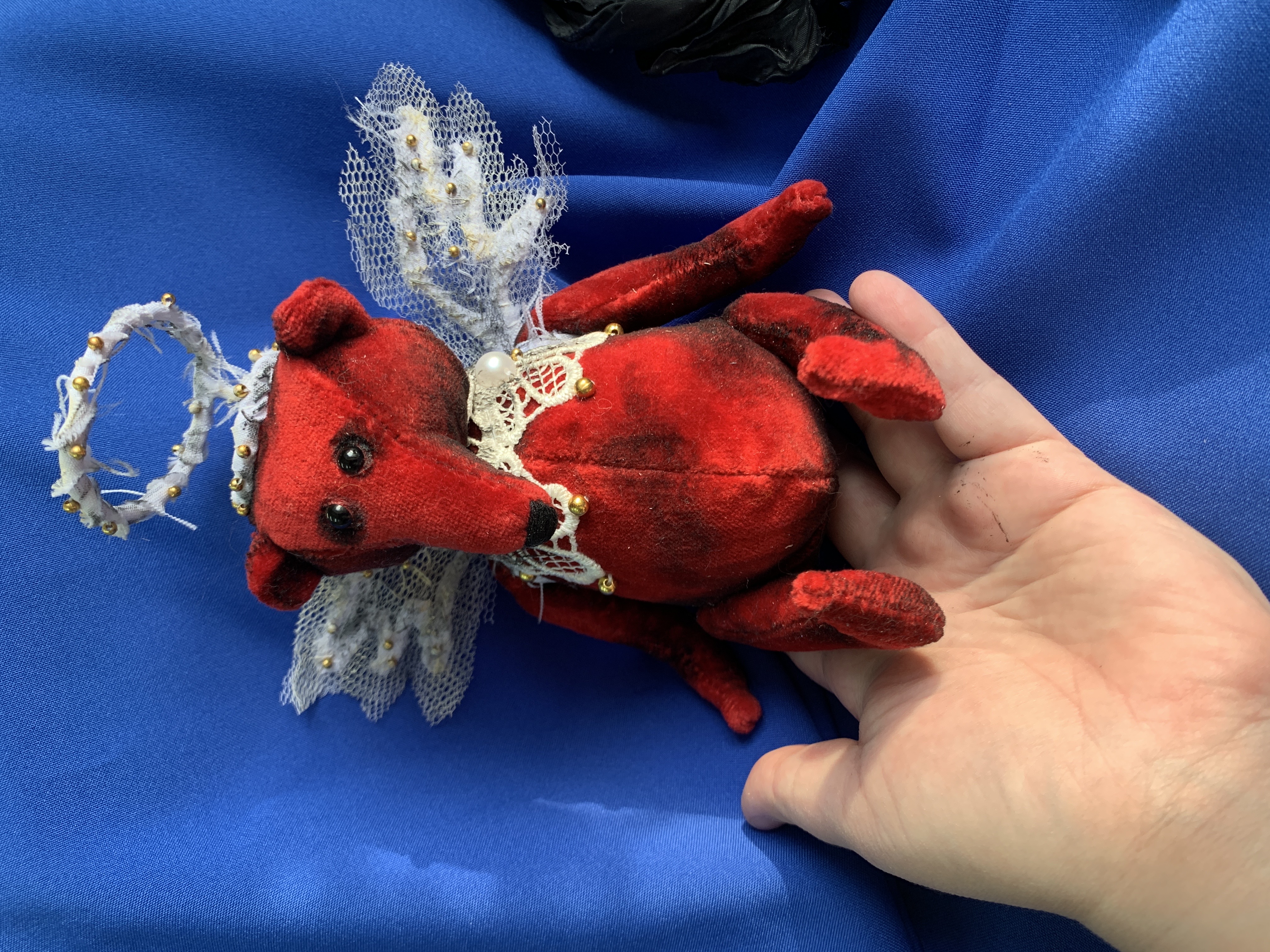 Плюшевый мишка из винтажного хлопкового бархата, набит древесными опилками. Фигурка статичная, глаза акриловые, роспись акриловыми красками по ткани. Декорирован кружевом, золотыми бусинами 2х размеров и полубусины под жемчуг. Основа крыльев и нимба - сталистая проволока, габардин и белый фатин.