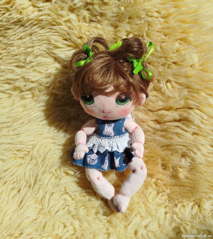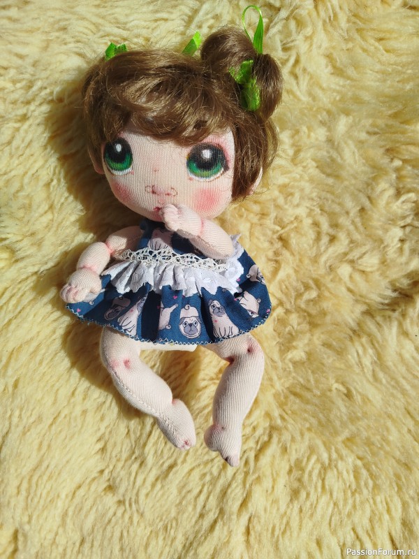 Спасибо, Татьяна! Глаза в следующий раз поменьше сделаю, я ведь сначала рисую лицо, а потом крою и шью голову. А имя из-за прически — моя младшая сестрёнка всегда кудряшкина, барашкина
