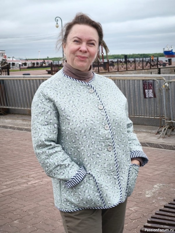 На осенней ярмарке одна дама со спортивной фигурой обратила внимание на мужской ватничек, померяла. Он ей понравился. И она после ярмарки вернулась и решила заказать такой же , только на женскую сторону застежку сделать. Немного подшаманили, спинку уменьшили, трапецию в бедрах дали. Получилась тужурка. Но пока дама думает, непривычна для нее такая одежда, хоть и нравится.