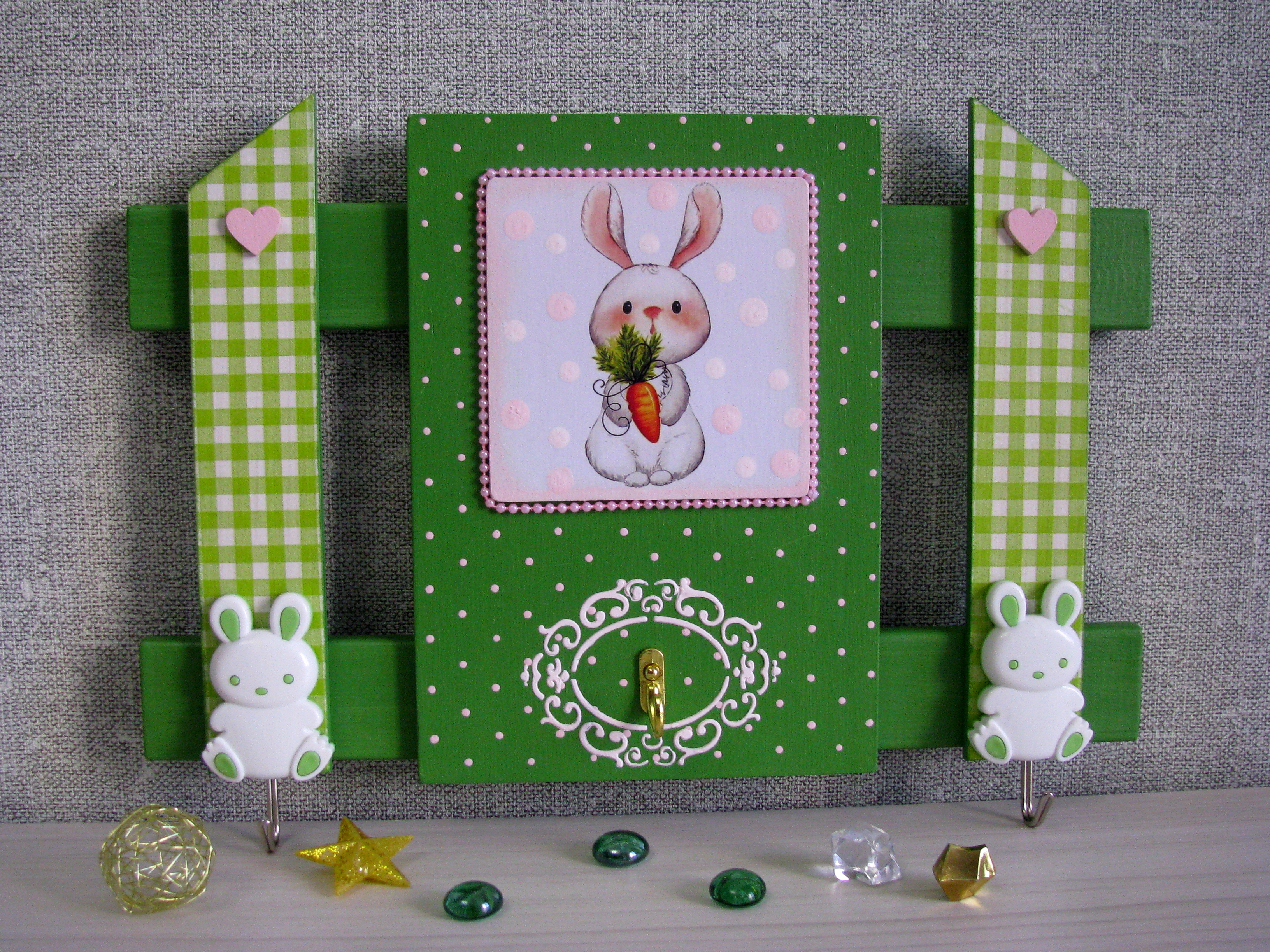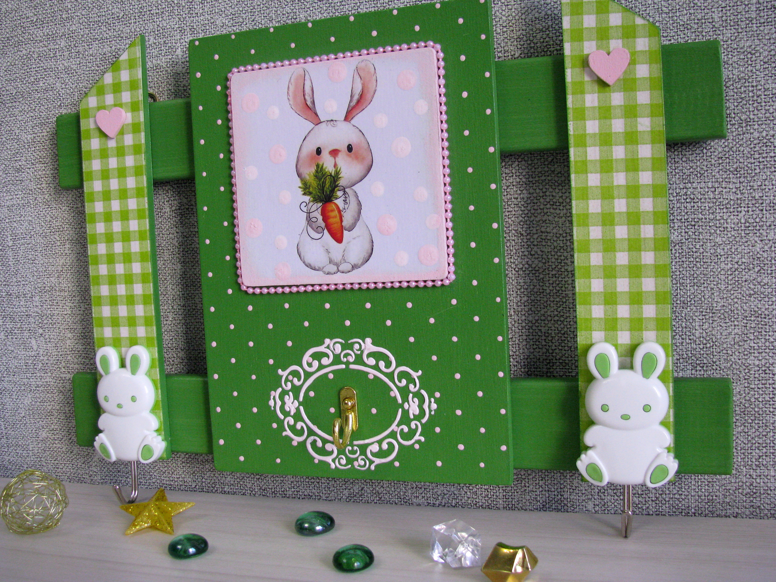 Зайка с морковкой в обрамлении нежного фона с розовым горошком и розовыми бусинами на нити и зайки-крючки на светло-зеленом фоне с розовыми сердечками составили дружную компанию.