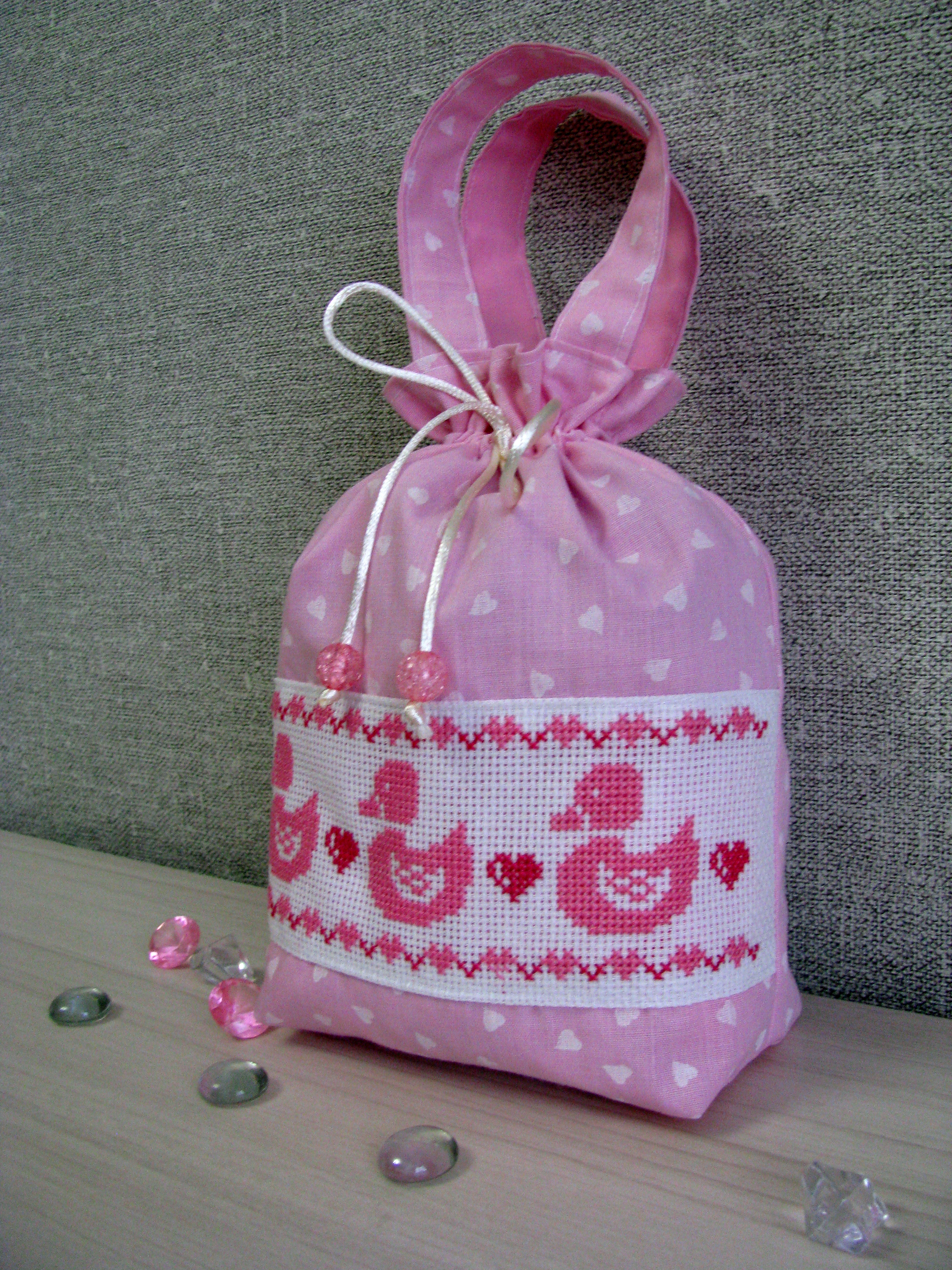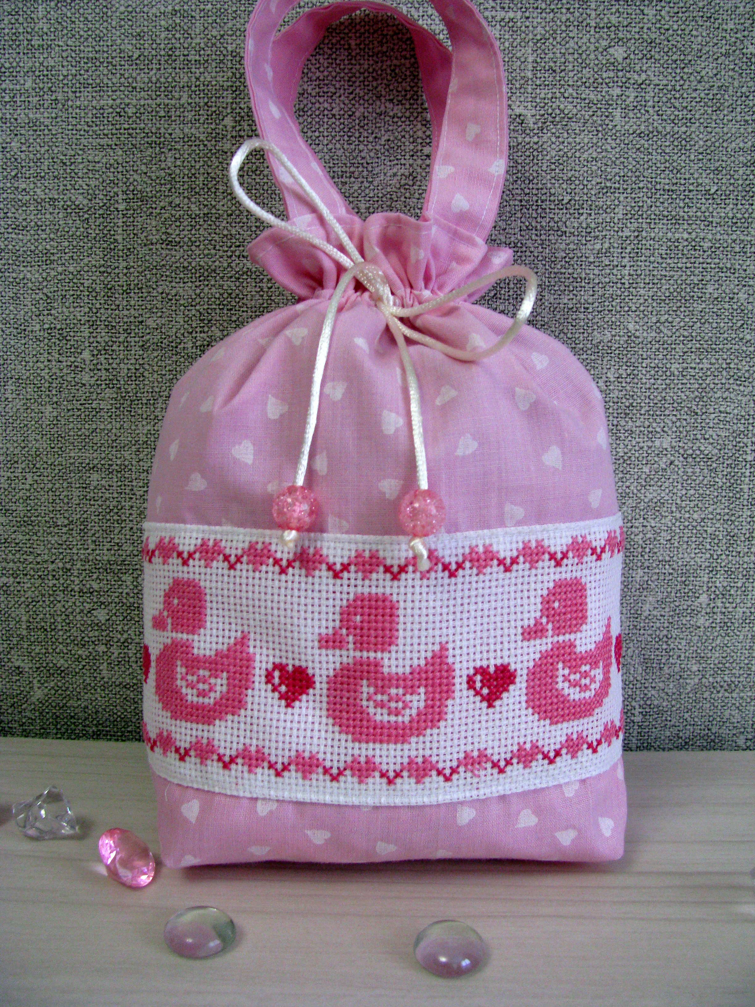 На практике у девочек много чего накапливается нужного в жизни. Это бантики, ленточки, заколочки, носочки всевозможных цветов, с рисунком и без. Такую мелочь удобно хранить на вешалке, чтобы всё было под рукой. И к "Зайке" присоединилась торбочка из розовой бязи с сердечками и вышивкой.