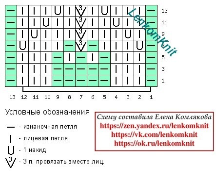 После каймы основная часть вяжется узором по второй схеме. Раппорт узора 14 рядов и 12 петель + петля для симметрии (для удобства изнаночные петли отмечены зеленым цветом). Схема для лицевых рядов, изнаночные вяжутся по рисунку. По бокам по-прежнему вяжем планку горизонтальной резинкой до конца деталей.