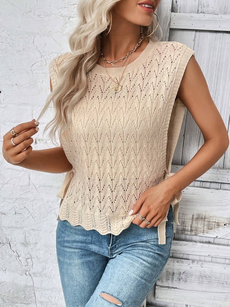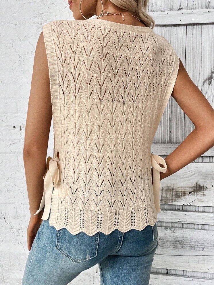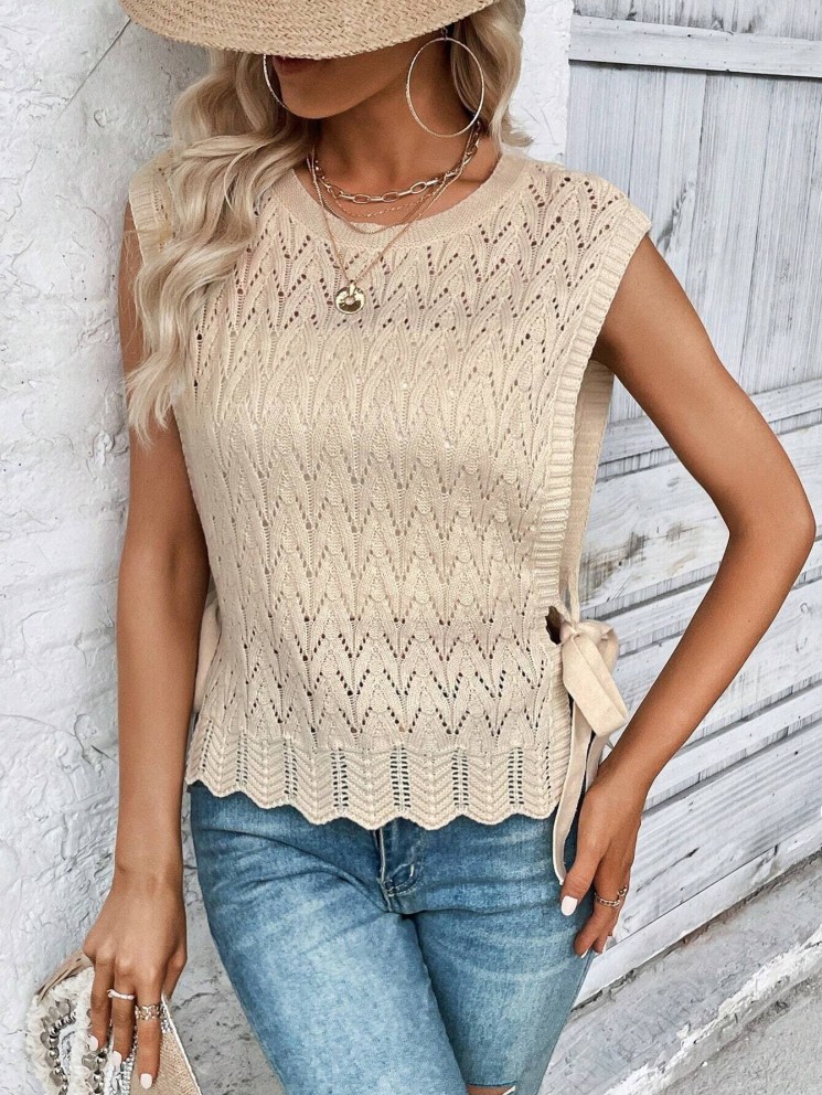 В этой модели нет боковых швов, они закрепляются поясом. Он продет в отверстия, которые сделаны в боковых планках вертикально. Для этого петли планки разделяются и вяжутся отдельно 2-3 см. (придется в этом месте вязать от двух мотков, точнее, присоединить еще одну нить для вязания половинки планки на длину разреза (понадобится немного, около метра).
