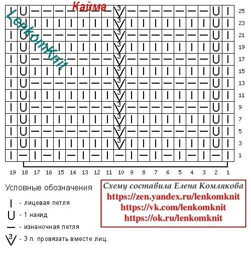 Вязание начинается снизу вверх. Первые два ряда – резинка 1х1. Затем петли разделяются. По бокам вяжется цельновязанная планка (примерно 8 петель), а основная часть – кайма по первой схеме. Ее раппорт – 18 петель + петля для симметрии, в высоту – с 3 по 26 ряд. На схеме – лицевые ряды, изнаночные вяжем по рисунку.