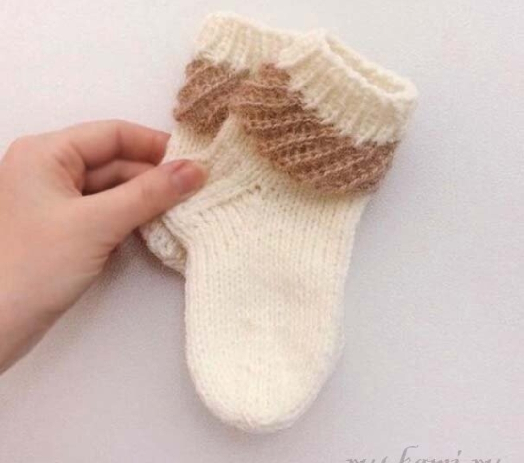 Детские носки спицами вяжем из двух цветов пряжи. Такие красивые носочки с интересным ажурным узором подарят тепло и комфорт детским ножкам.