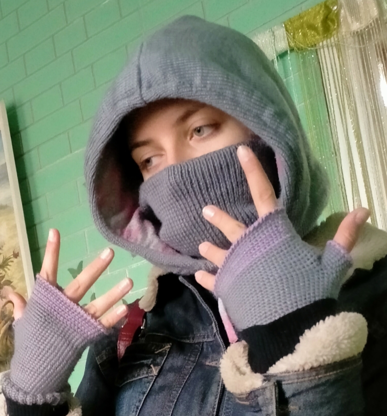Здравствуйте. Связала капор на флисовый подкладке спицами и митенки крючком.