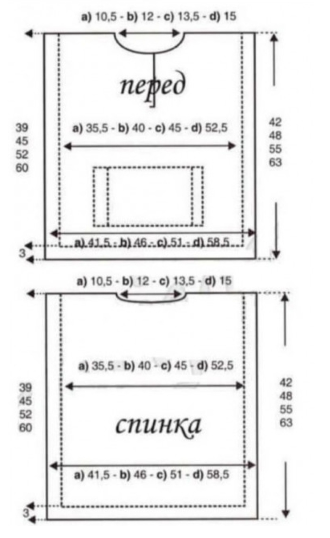 Набираем a. 48 п., b. 52 п., c. 58 п., d. 66 п. Вяжем платочной вязкой 6 рядов (3 полоски). Продолжаем вязать таким образом: 4 п. платочной вязкой, 48-44-50-58 п. гладью, 4 п. плат. вязк. На расстоянии 36-42-49-57 см. (58-68-80-92 р.) от плат. вязки, оформляем горловину, закрыв. центр.: 4 — 6 — 6 — 8 п., далее продолжаем с первой стороны закрывать: a,b — 1 раз 3 п., c,d — 1 р. 4 п. На расстоянии 39-45-52-60 см., (62-72-84-96 р.) от плат. вязки закрываем для плеча 19-20-22-25 п. Заканчиваем вторую половину горловины.