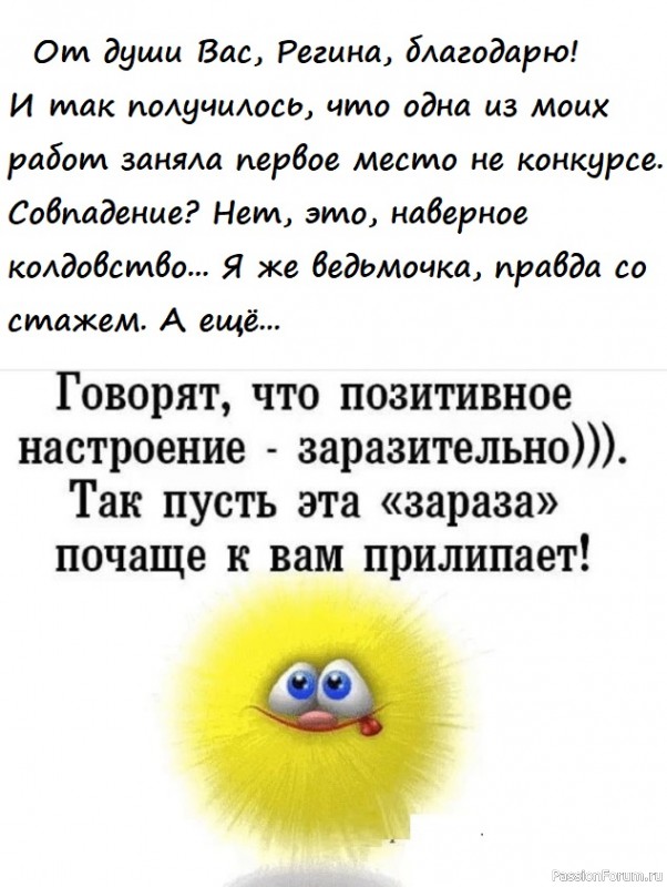 Людмила, первое место на конкурсе ведьмочек Ваше!!! Восхищаюсь Вашим оптимизмом и радуюсь за Вас!!! Желаю Вам в любых жизненных обстоятельствах находить повод для радости!!!