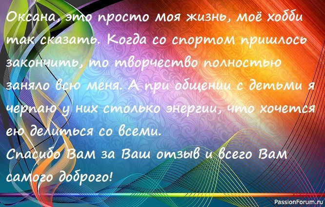 Томочка, дорогая, мне так приятно читать твои слова, до глубины души! Я очень рада, что нас познакомил наш форум, спасибо ему за это. И огромное спасибо за твои пожелания! Я буду очень стараться жить с огоньком и дальше. Примерно вот так