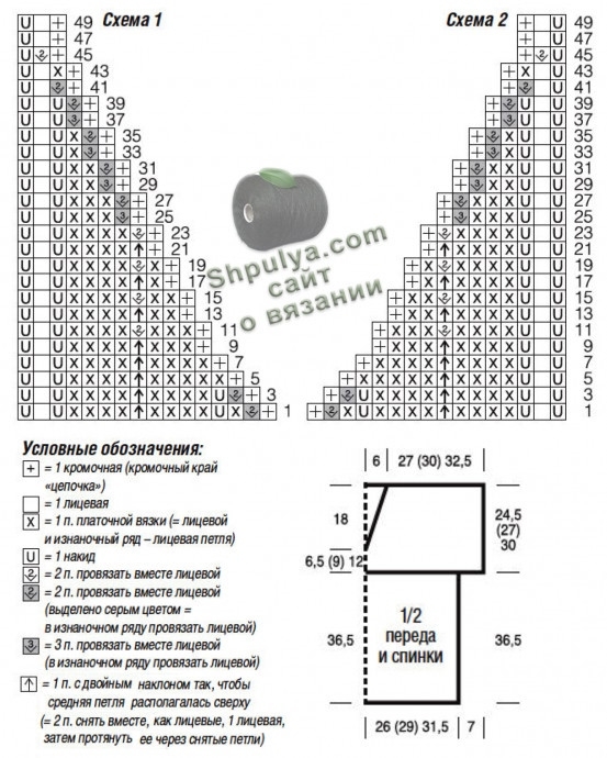 С правого края = вязать по схеме 1. На ней даны только лицевые ряды; в изнаночных рядах петли провязывать по рисунку, накиды провязывать изнаночными или согл. условным обозначениям. Выполнить 1 раз 1-50-й р.