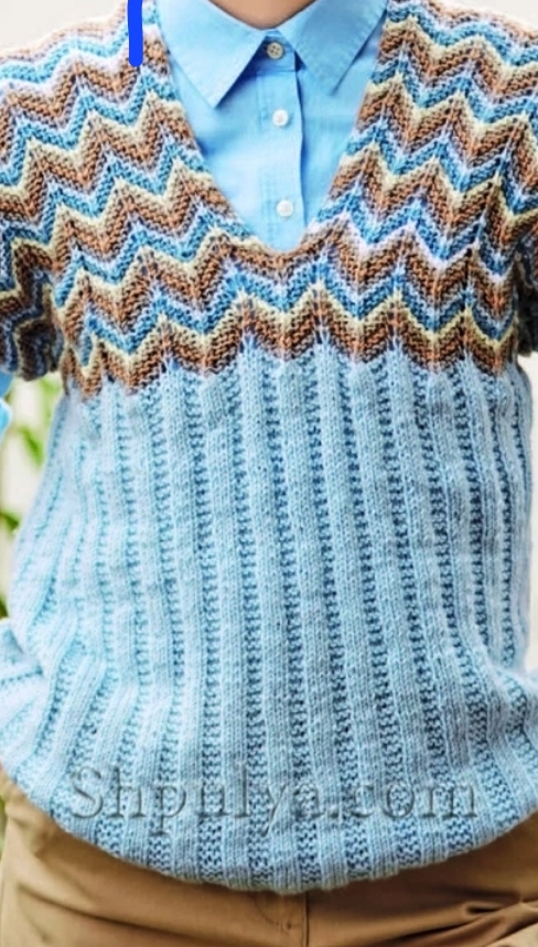 Вам потребуется: пряжа (100% полиакрила; 250 М/100 г) — 300 (400) 400 г голубой и по 100 г серой, джинсово-синей, белой, серо-коричневой и темно-бежевой; спицы № 3,5.