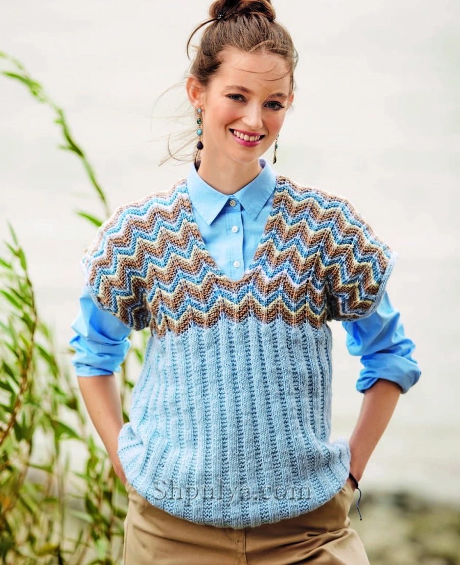 Уютный жилет с V-образным вырезом и кокеткой, украшенной пестрым зубчатым узором, будет сопровождать вас повсюду круглый год. Сейчас наденьте под него водолазку или блузку с длинными рукавами, а летом носите прямо на голое тело.