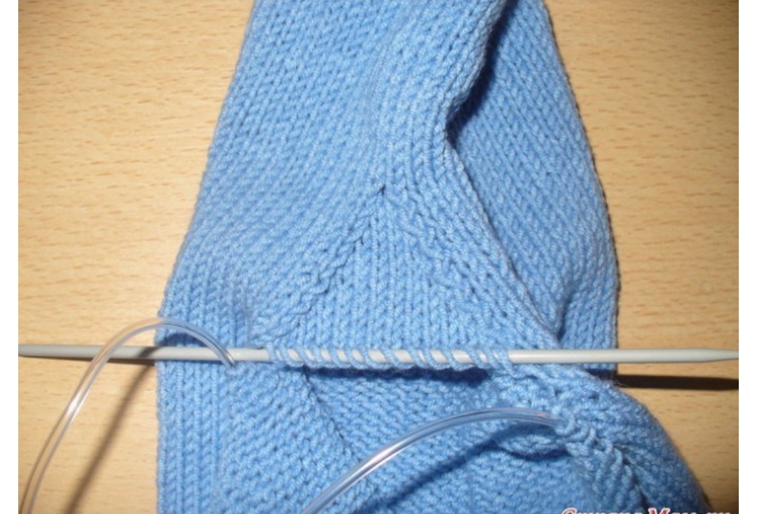 Вяжем по кругу первый ряд все петли лицевыми. Во втором ряду начинаем убавлять прибавленные петли таким образом - 2 петли вместе лиц. (одна петля из числа штанинки, вторая из набранных), провязываем лиц. набранные петли, кроме последней, ее вместе с петлей из штанинки провязать лиц.
