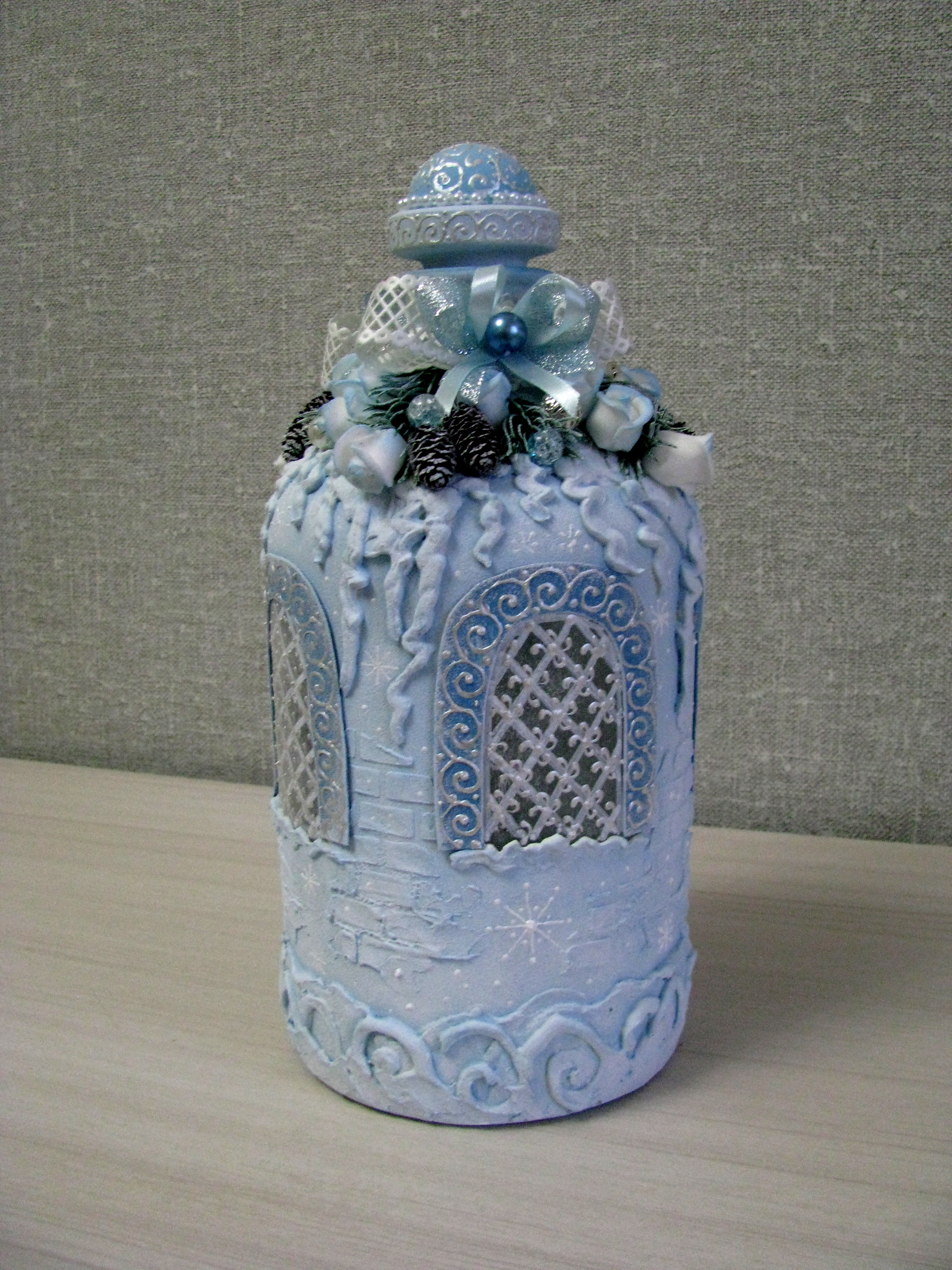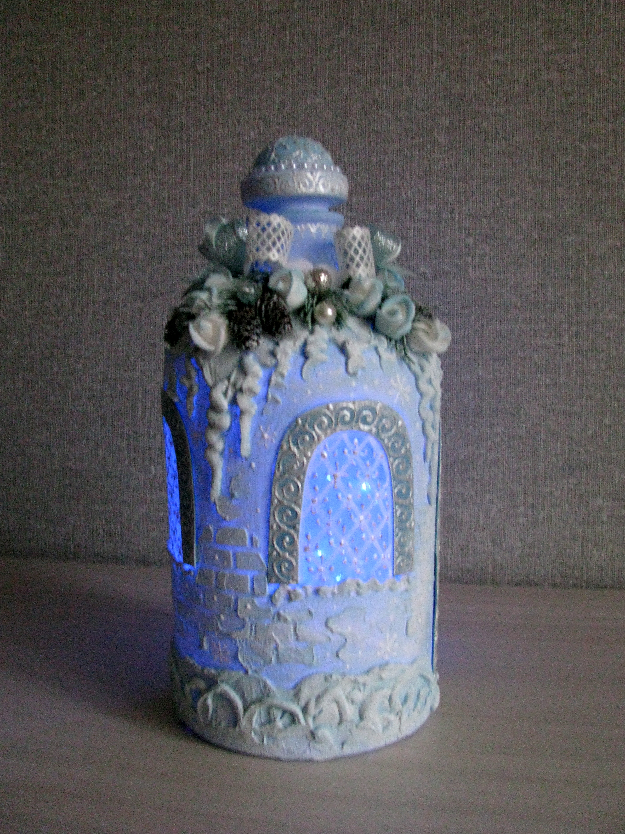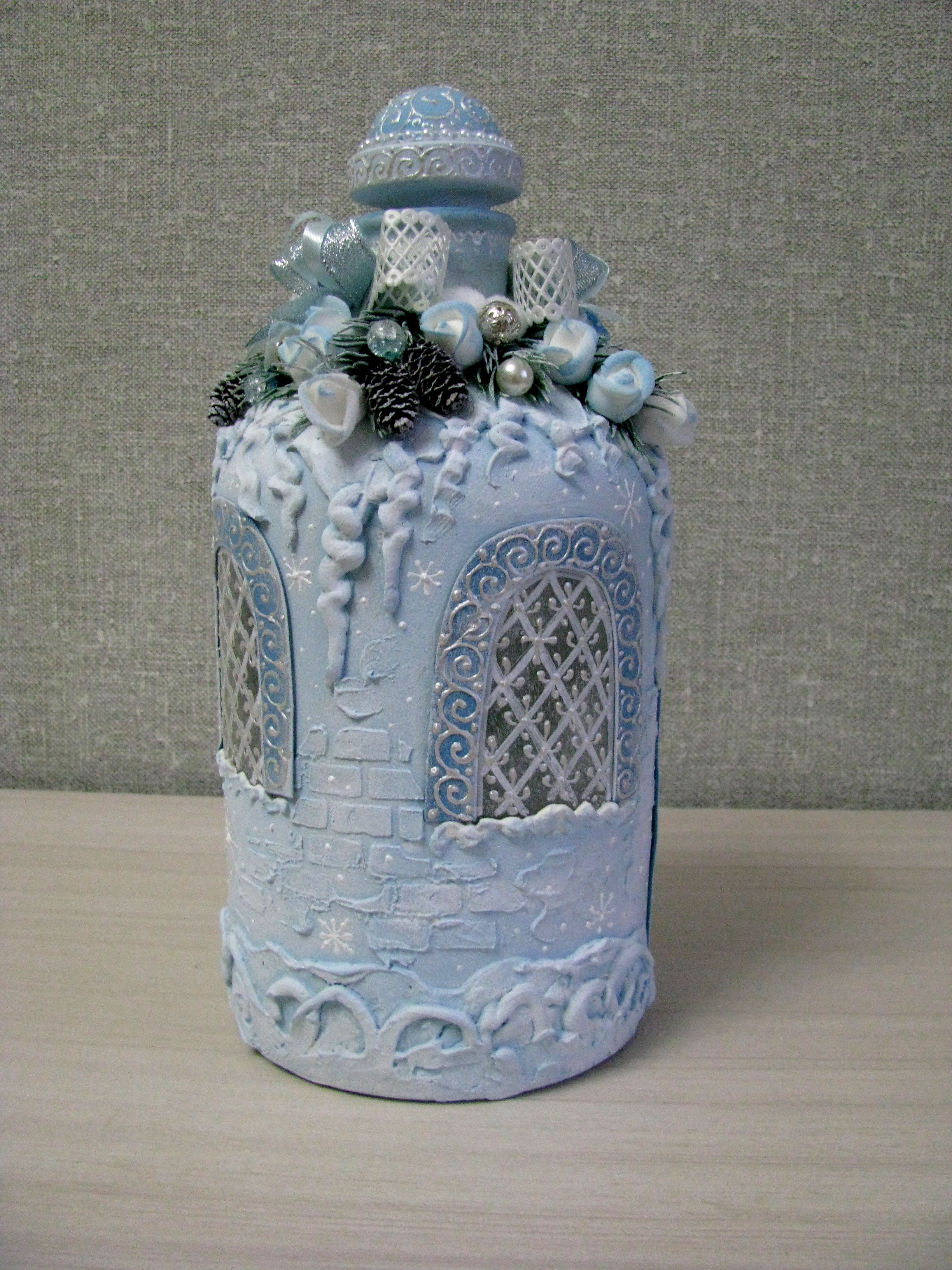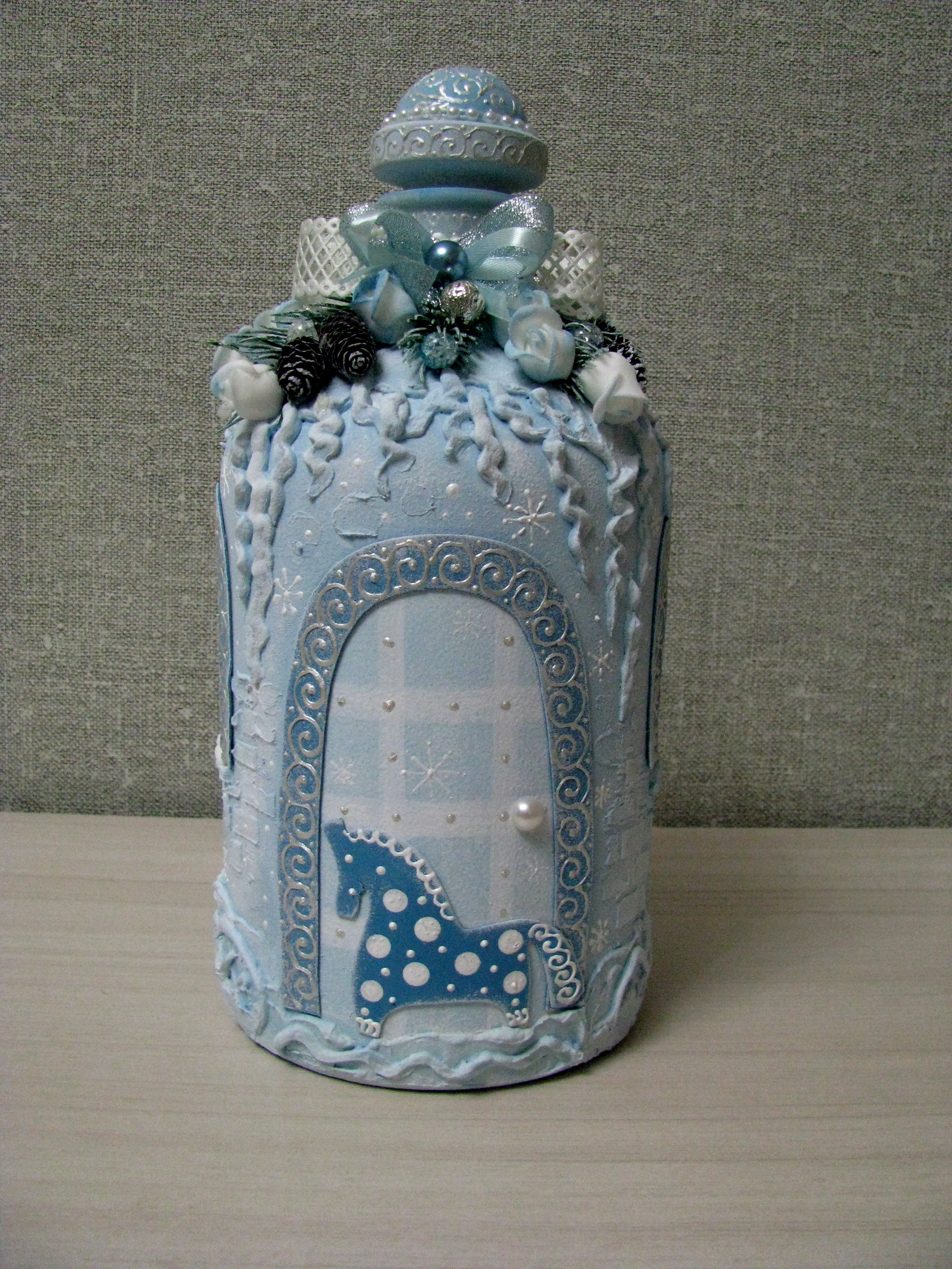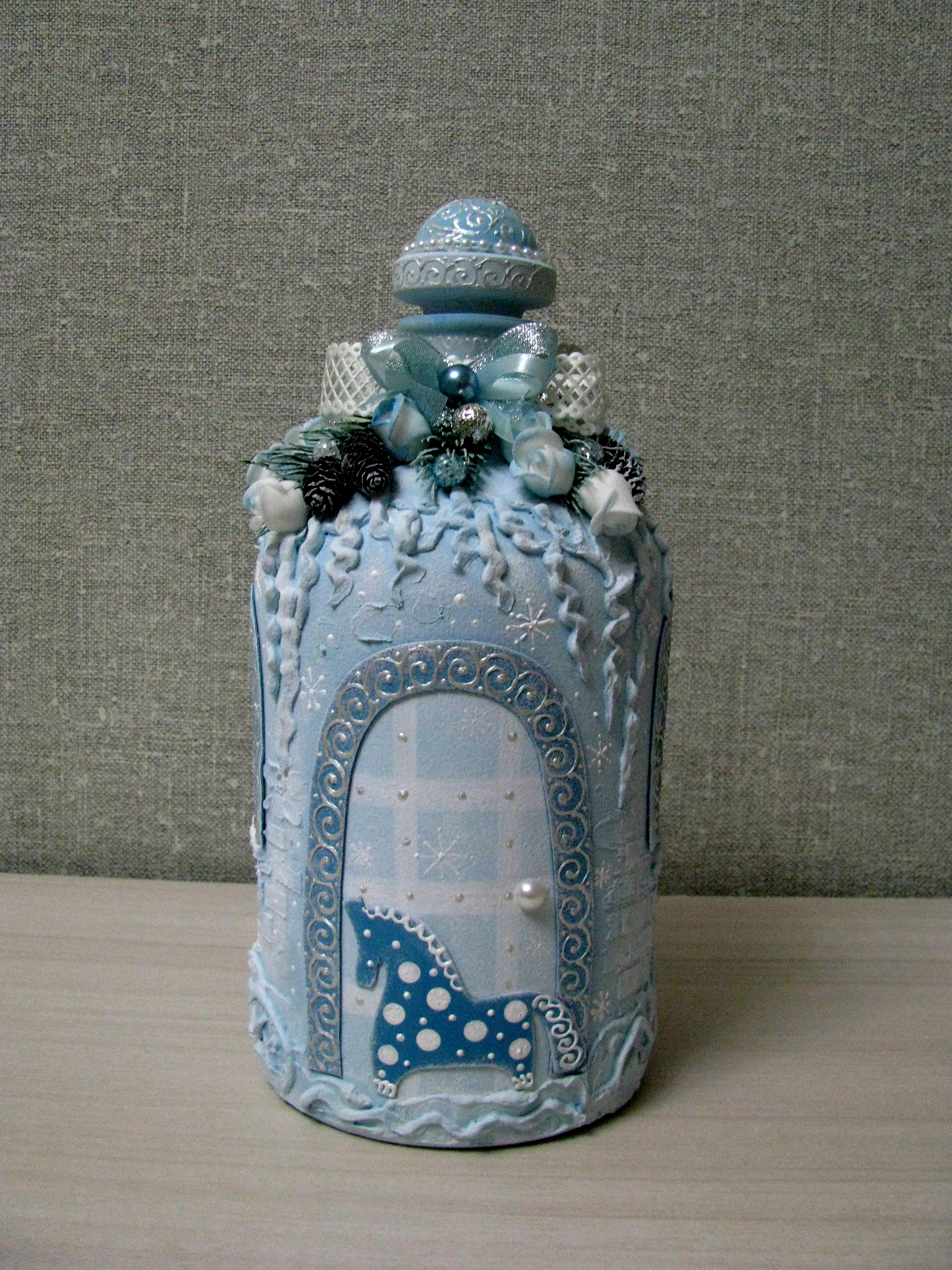 Давно я не декорировала бутылки, решила тряхнуть стариной. Идея домика окончательно созрела, работа закипела, и родился сказочный домик, с крышей из еловых веток с шишками, украшенных цветами, бусинами, лентами. Расписные наличники вокруг окон и двери, витражные окна с перламутровым серебристым узором и, конечно, лошадка у входа в дом.