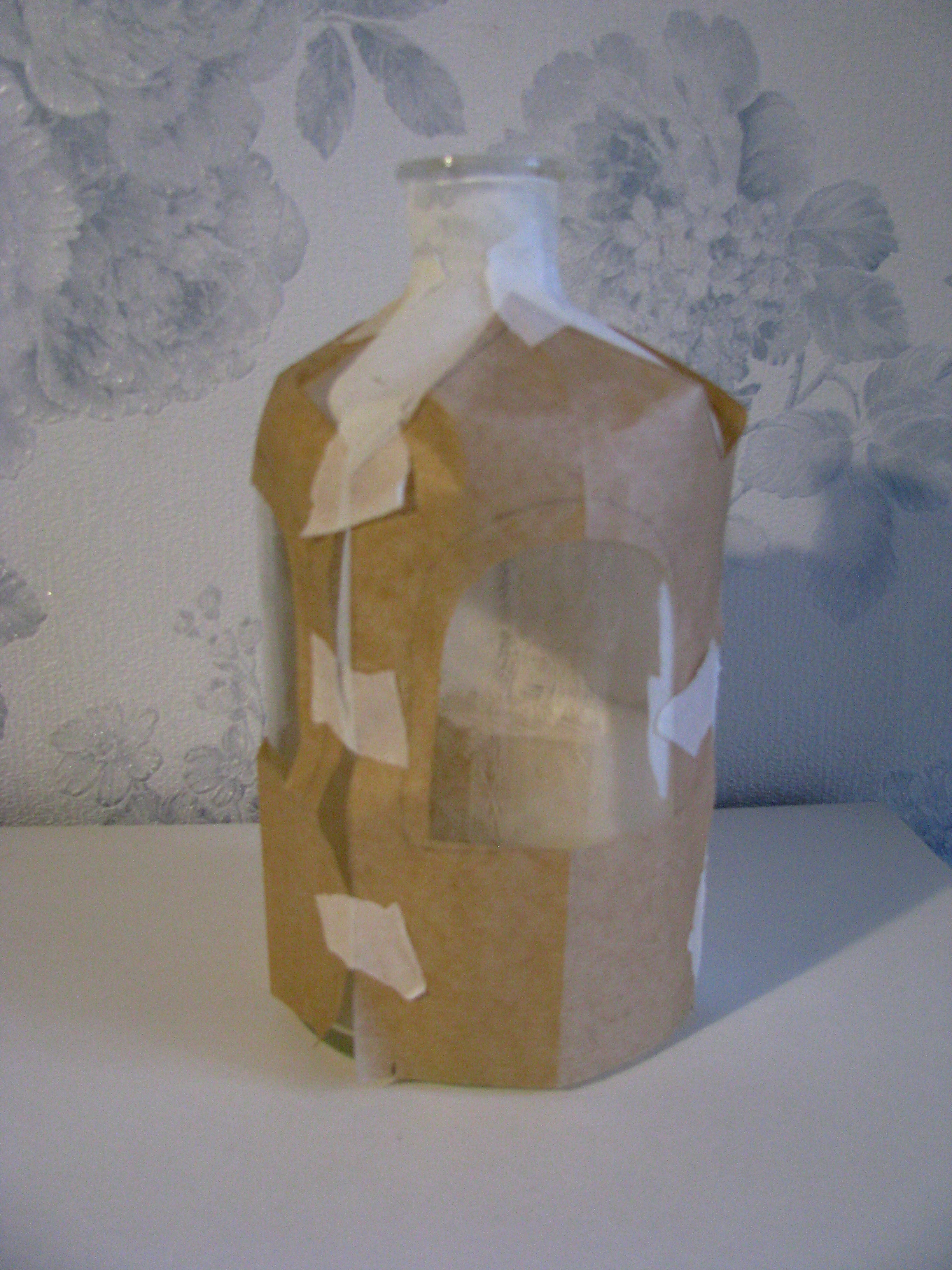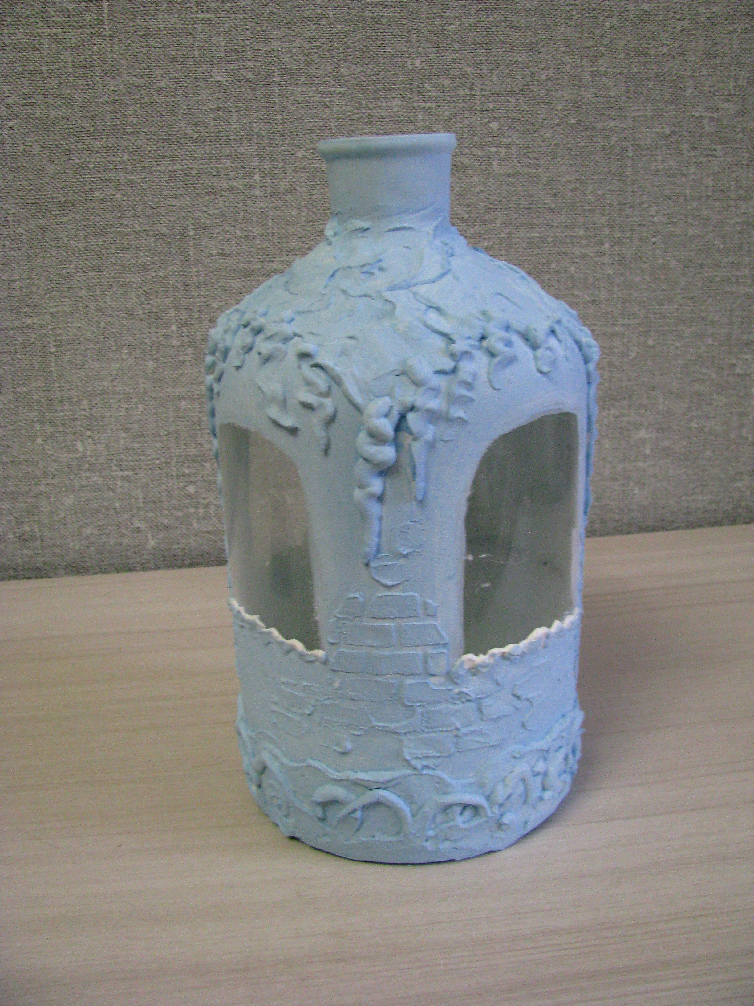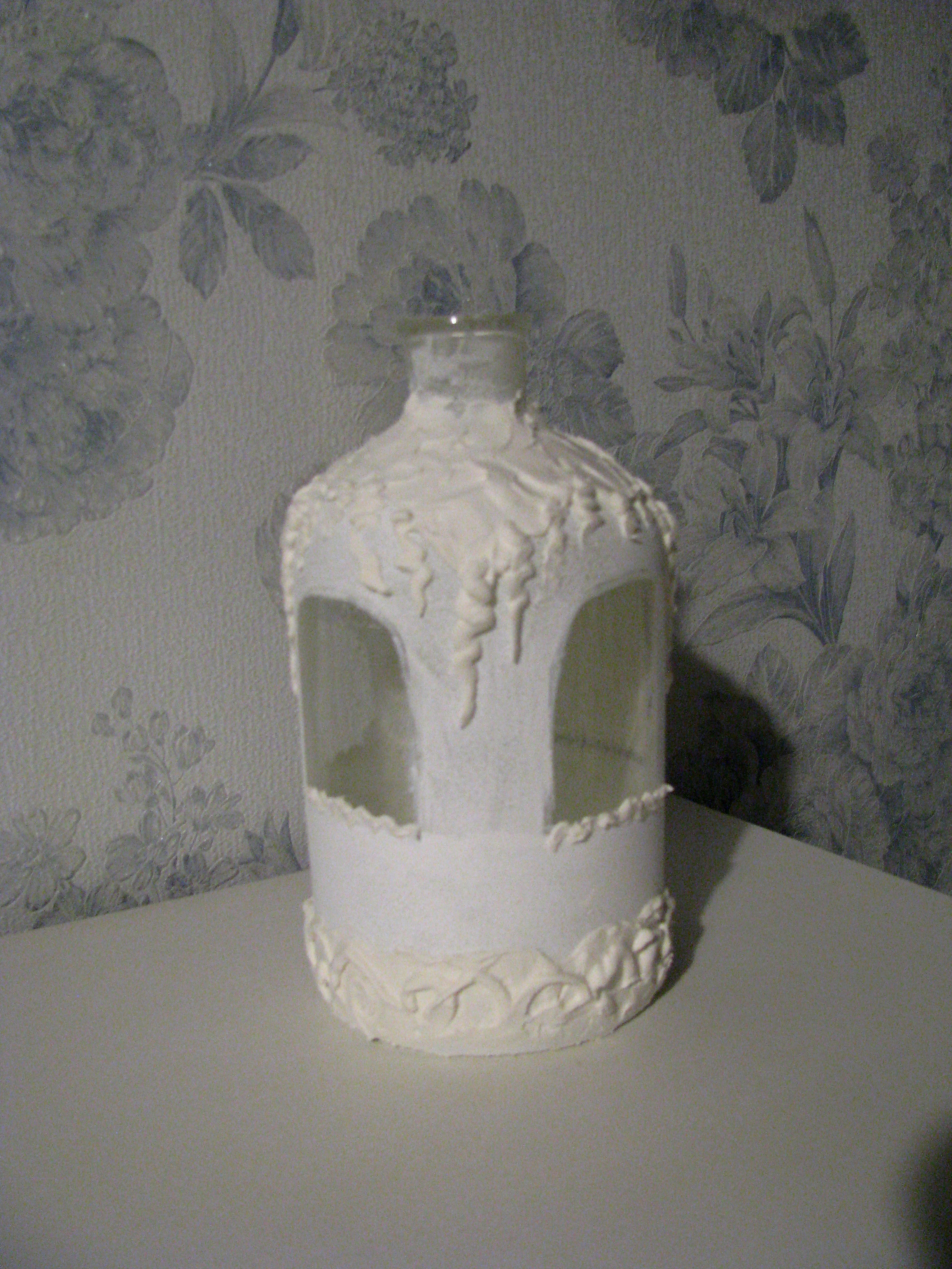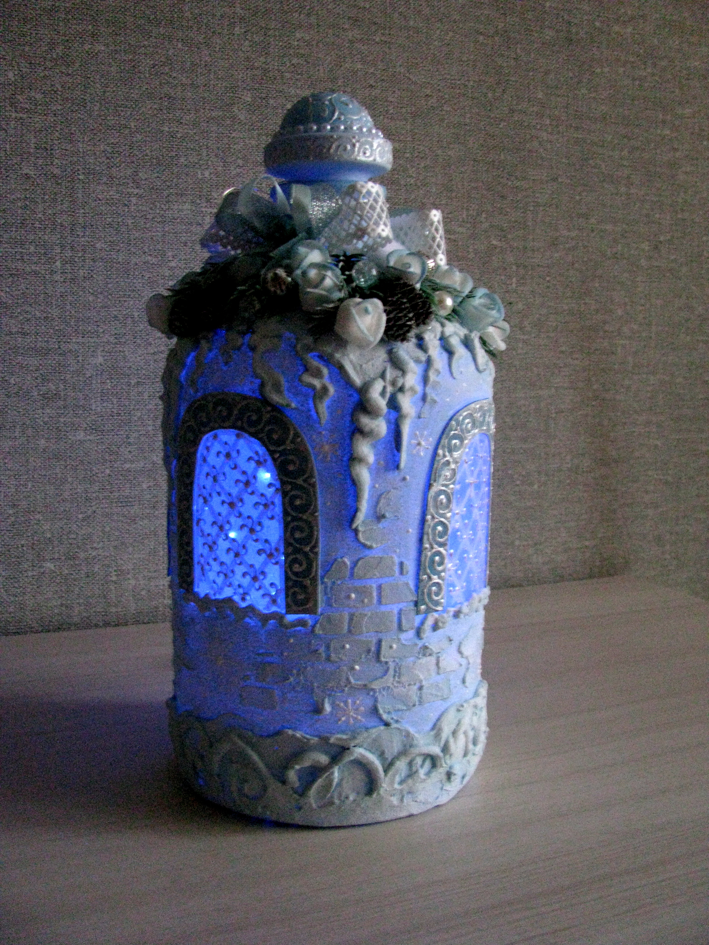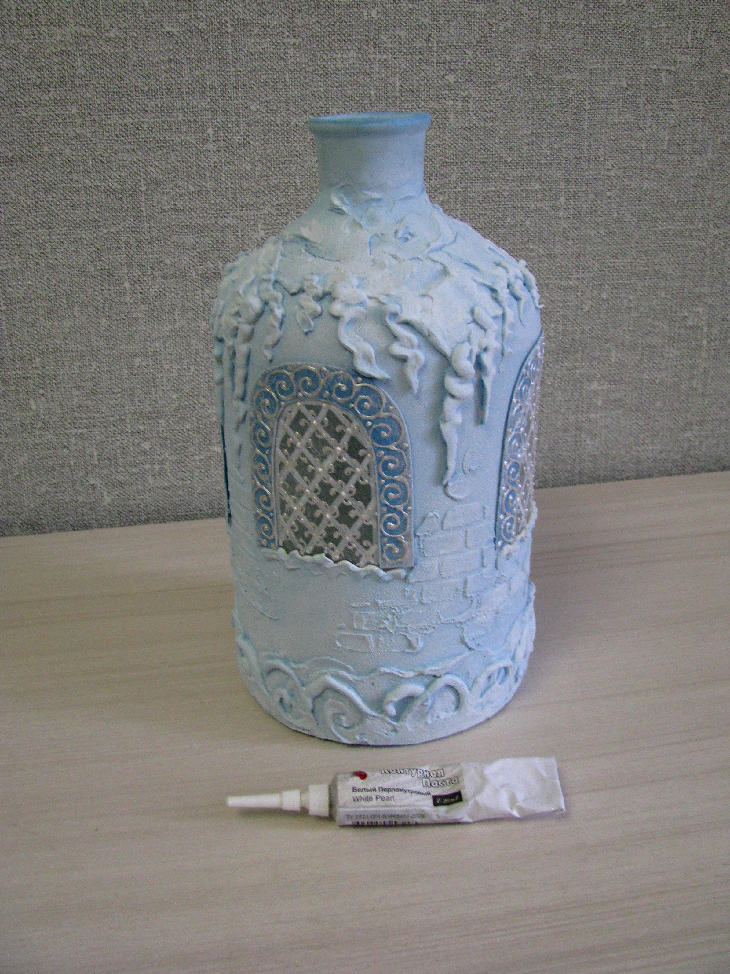 Давно я не декорировала бутылки, решила тряхнуть стариной. Идея домика окончательно созрела, работа закипела, и родился сказочный домик, с крышей из еловых веток с шишками, украшенных цветами, бусинами, лентами. Расписные наличники вокруг окон и двери, витражные окна с перламутровым серебристым узором и, конечно, лошадка у входа в дом.