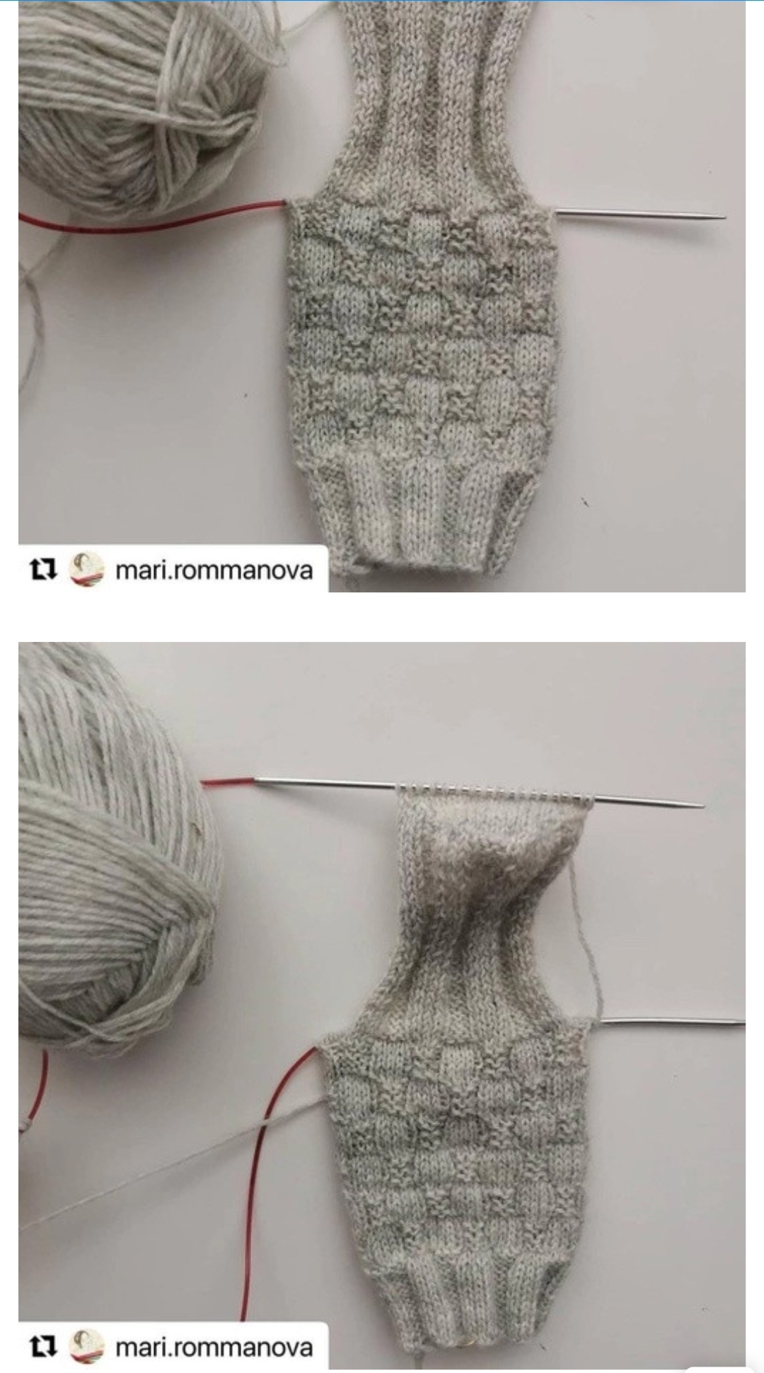 Делаем убавки через ряд на крайних петлях задней части до того момента, пока на спицах задней части не останется первоначальное количество петель: 28/28/36.