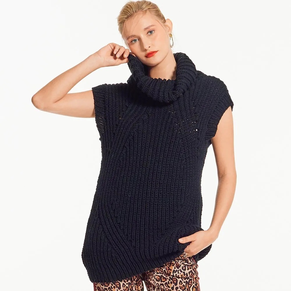 Техника вязания с декоративными прибавками и убавками создает удивительно современную структуру. Воротник XXL и толстая пряжа позволят носить такую безрукавку даже поверх тонкой куртки.