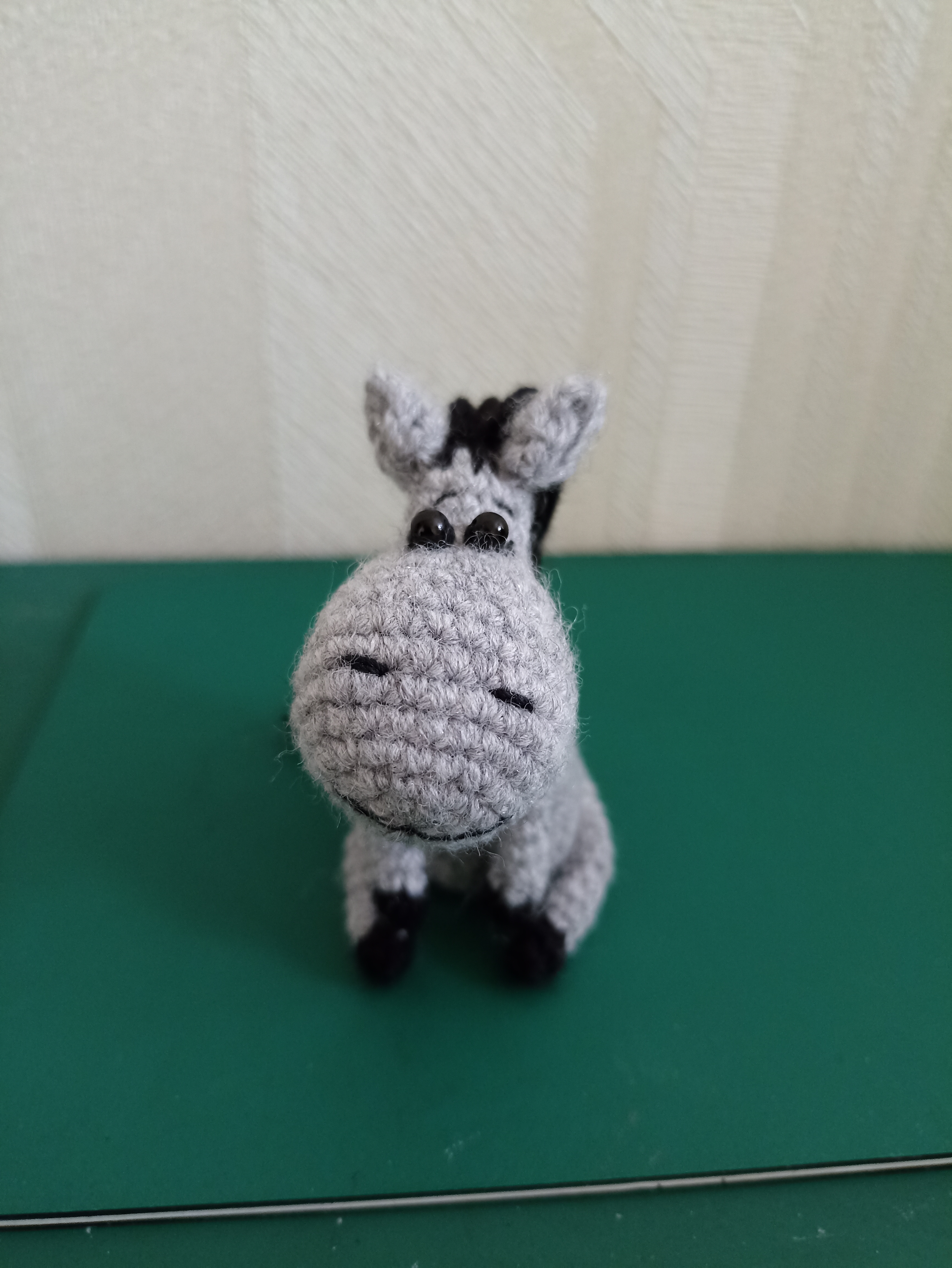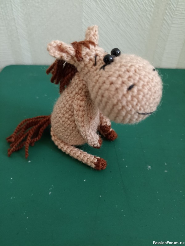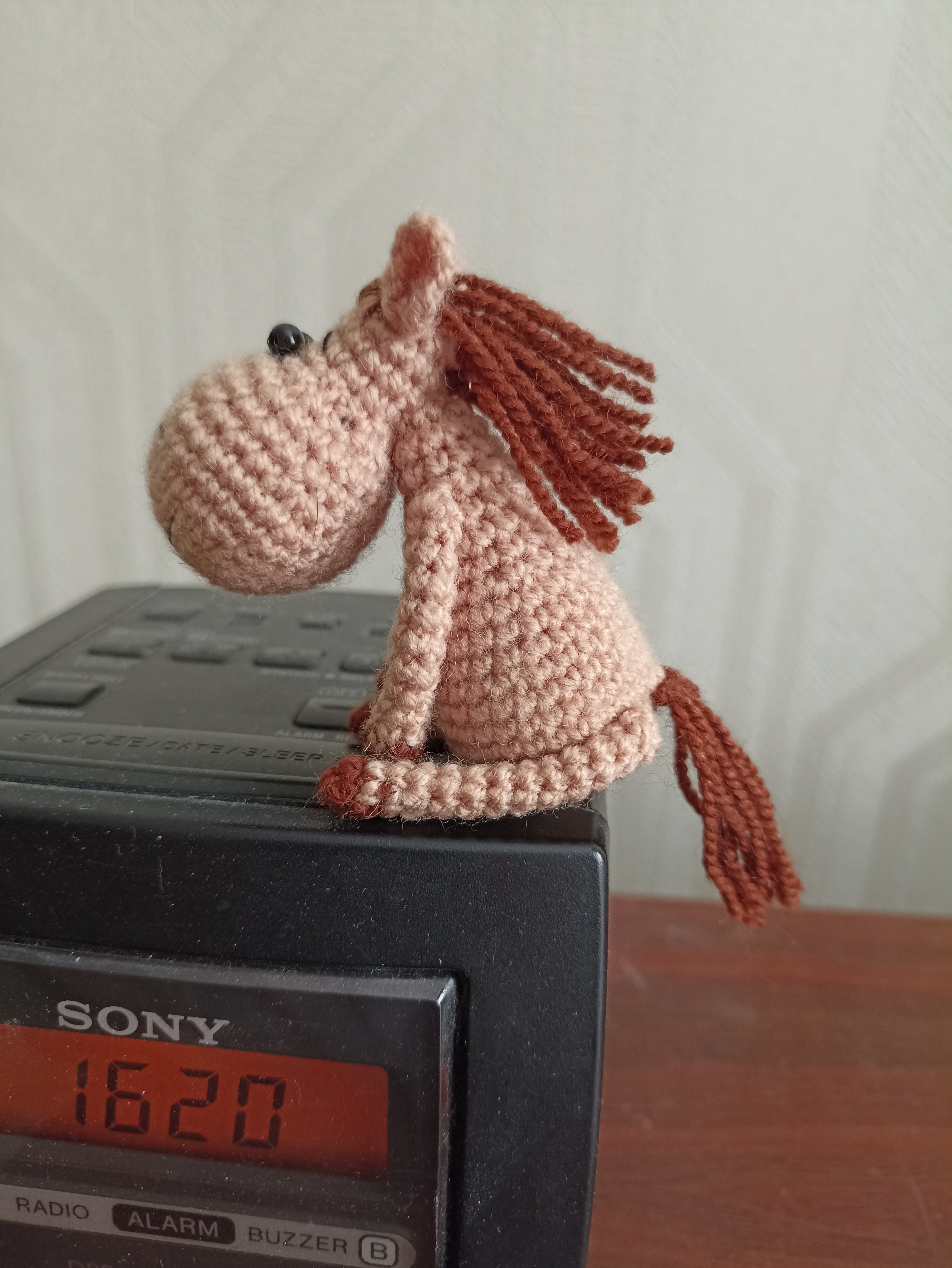 Это чудо было найдено на просторах интернет ещё ранней осенью, но была это овечка...Автора, к сожалению, не помню. Я немного доработала описание и решила, что это будет похоже на лошадку из мультика. Но судить вам. что это за зверь. Пряжа Бисерная от Пехорки, крючок 1,6 мм, получилась игрушка высотой 6,5 см.