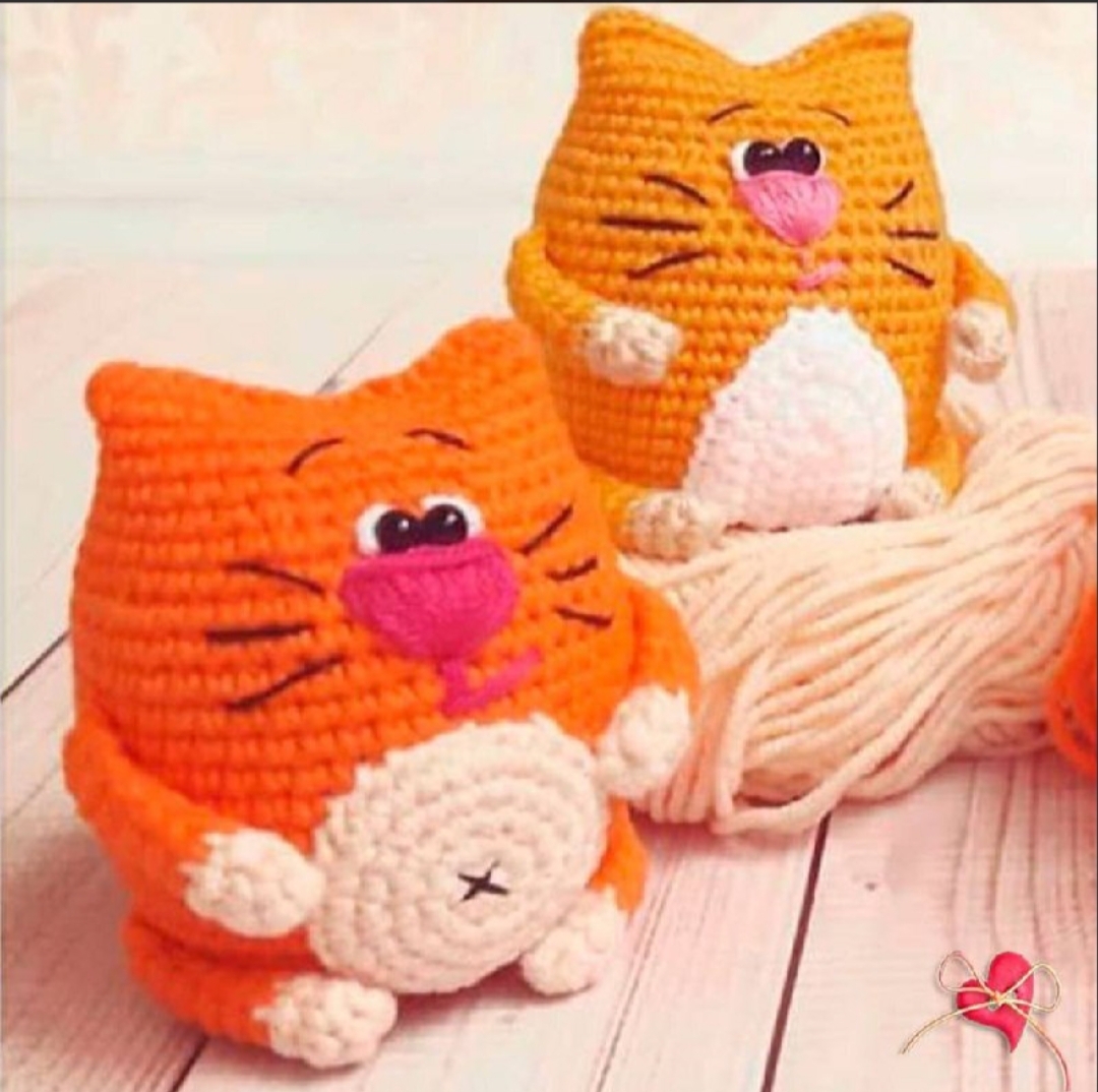 Очаровательные вязаные котики выполнены в технике амигуруми с акцентом на объемный белый животик, который контрастирует с ярко-оранжевым телом. Уникальная вышивка мордочки с розовым носиком и выразительными глазками придает игрушкам живой и добрый характер. Мягкие лапки и аккуратные ушки делают каждую фигурку особенно привлекательной и уютной. Идеально подходят для коллекционеров и любителей оригинальных текстильных сувениров.