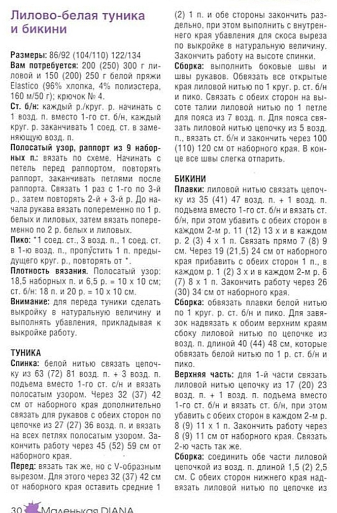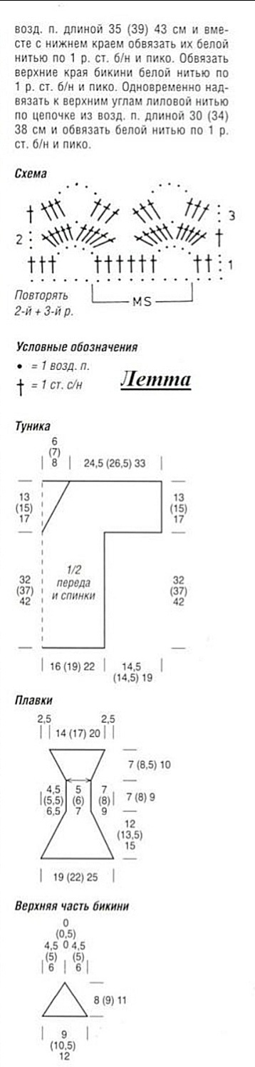 Сборка: соединить обе части лиловой цепочкой из возд. п. длиной 1.5 (2) 2.5 см. С обеих сторон нижнего края надвязать лиловой нитью по цепочке из возд. п. длиной 35 (39) 43 см и вместе с нижнем краем обвязать их белой нитью по 1 р. ст. б/н и пико. Обвязать верхние края бикини белой нитью по 1 р. ст. б/н и пико. Одновременно надвязать к верхним углам лиловой нитью по цепочке из возд. п. длиной 30 (34) 38 см и обвязать белой нитью по 1 р. ст. б/н и пико.