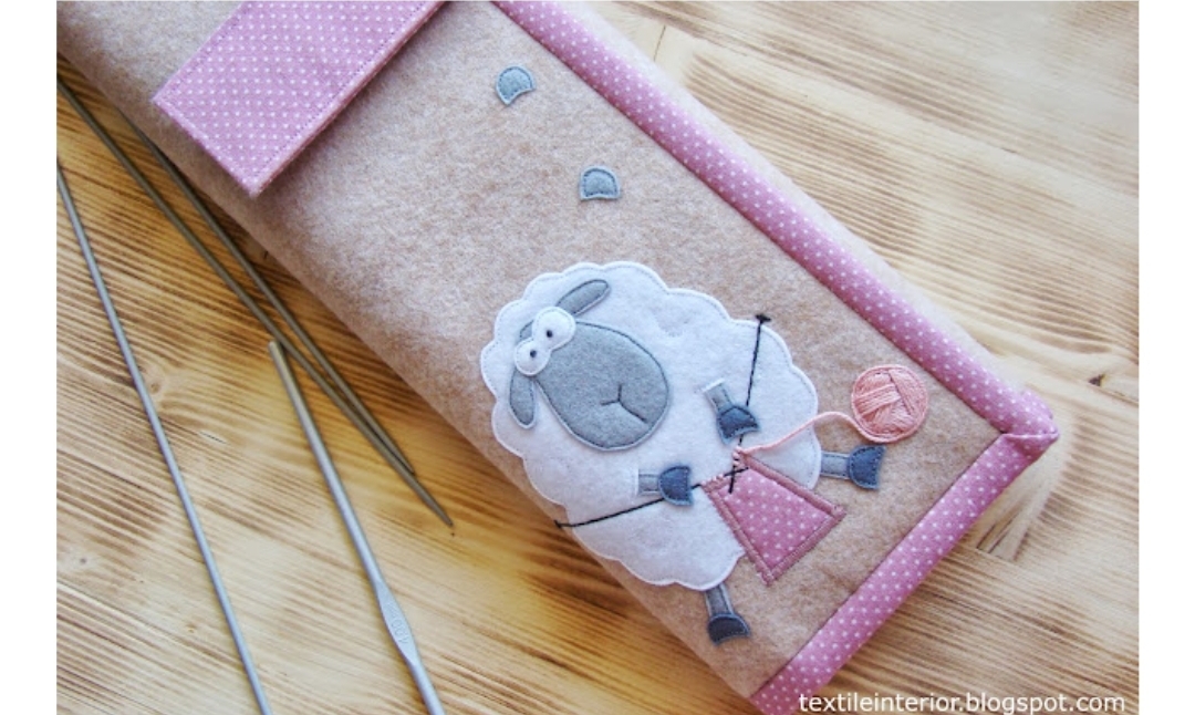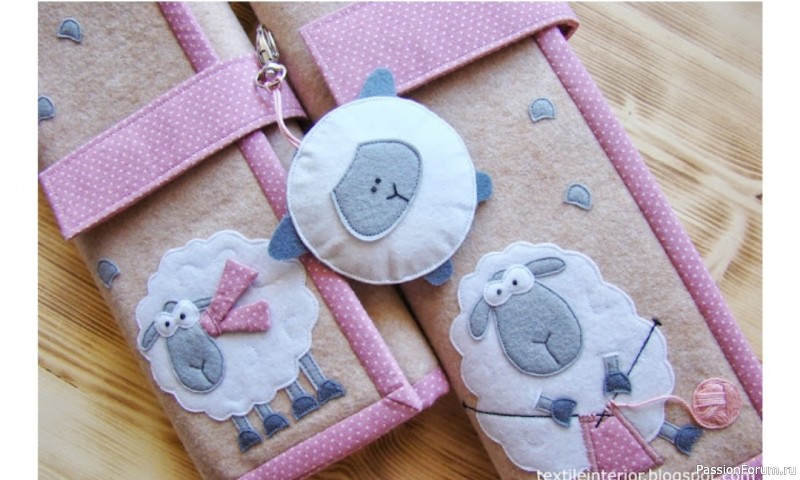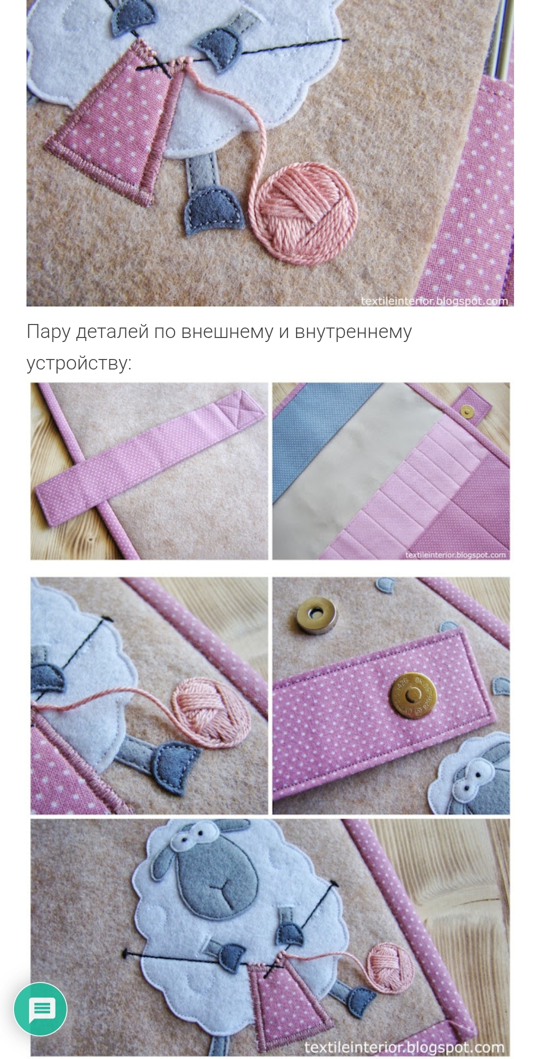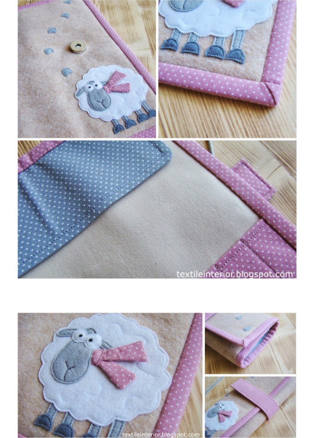 Из пожеланий — главным действующим лицом должна быть овечка, колористика — розово-фиолетовые приглушенные оттенки и полная свобода по воплощению для меня!;) В процессе обсуждения эскизов определились с деталями — акцентом, задающим тон композиции будет аппликация, а не клапан — застежка в виде овечки, оба органайзера будут объединены одним героем и единым цветовым решением, клапан же в виде полосочки ткани в тон бейки.