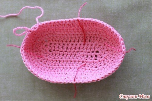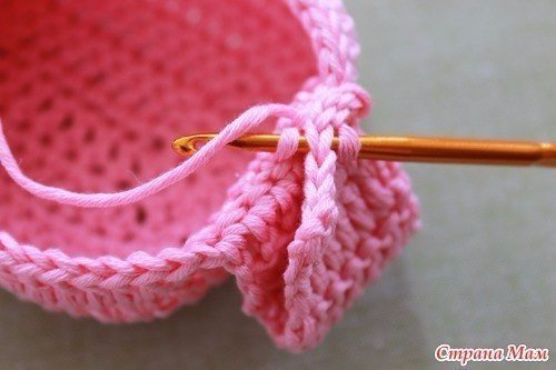 Обвязываем по кругу СН. Причем в горизонтальные столбики по 2 СН.