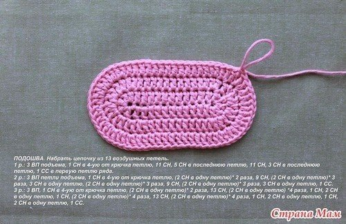 Вяжем петлю для ремешка. От центра пятки в обе стороны отсчитываем по 3 петли. Всего с центральной 7 петель. Вязание остановилось спереди, необрывая нитки, начинаем обвязывать край полустолбиками до отмеченных петель.