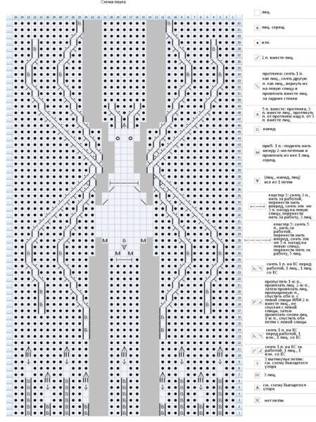 Далее, опираясь на схему, связать 4 ряда изнаночной глади и паука. Схема паука дана для вязания на круговых спицах, ней указаны все ряды.