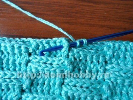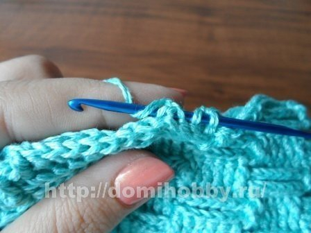 При вязании рельефных вогнутых столбиков крючок вводите за ножку столбиков предыдущего ряда за работой.
