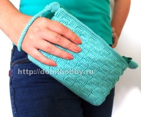 Далее переходите к вязанию основной части сумочки рельефным узором «плетенка». Продолжайте вязать также круговыми рядами, делая в начале каждого ряда воздушные петли подъема на высоту столбиков, и заканчивайте ряды соед. ст. в последнюю петлю подъема.