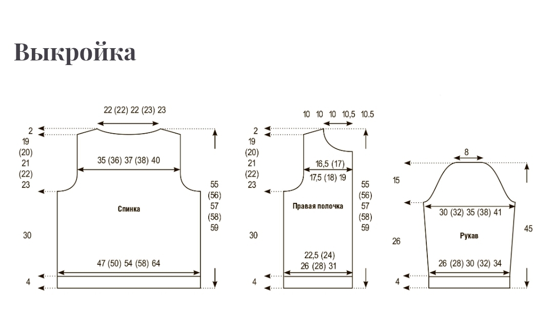 Через 53 (54) 55 (56) 57 см от начального ряда закрыть для плечевых скосов с обеих сторон в каждом следующем 2-м ряду 3 x 4 п. (2 x 4 п. и 1 x 5 п.) 1 x 4 п. и 2 x 5 п. (1 x 4 п. и 2 x 5 п.) 2 x 5 п. и 1 x 6 п.