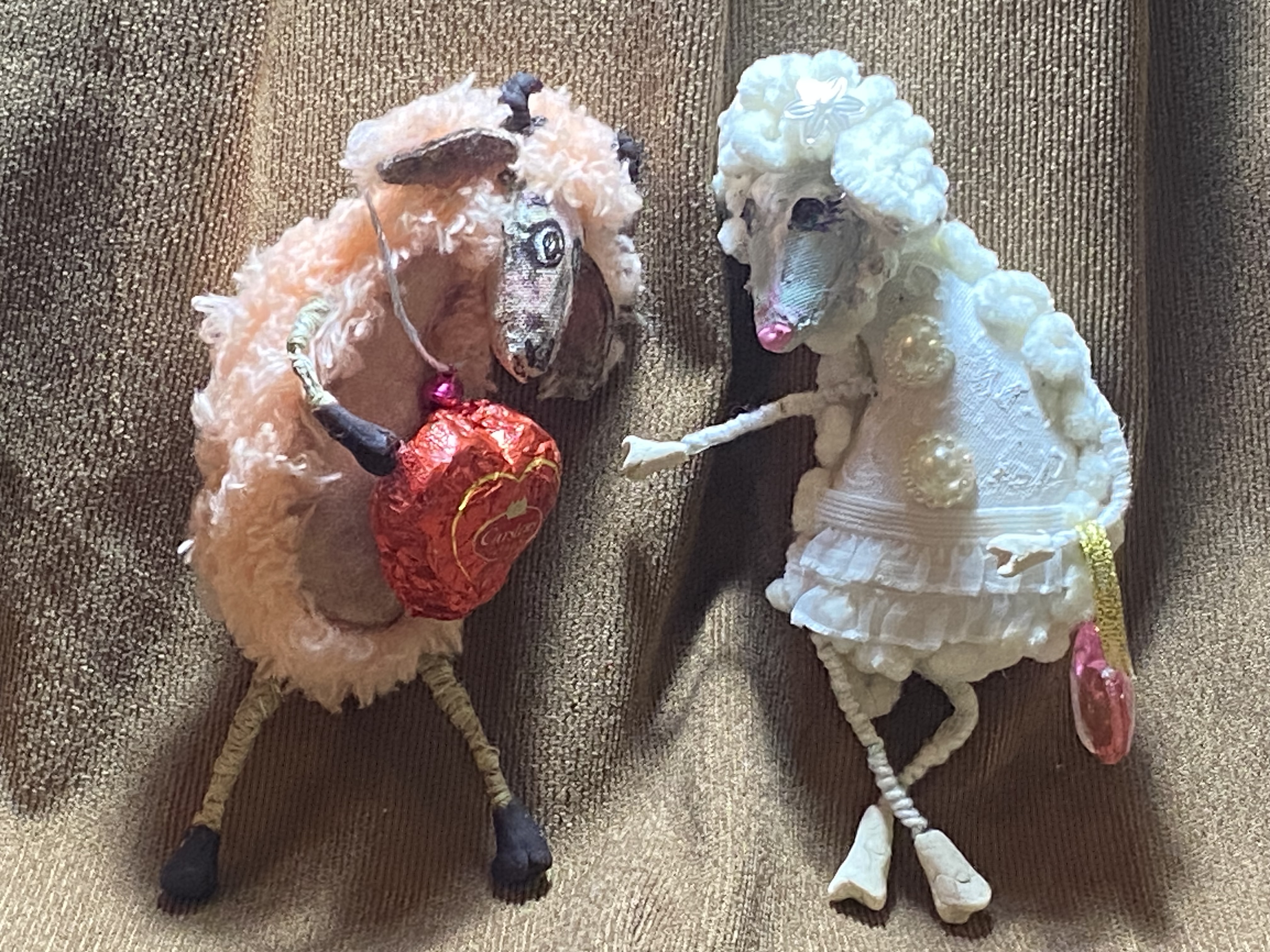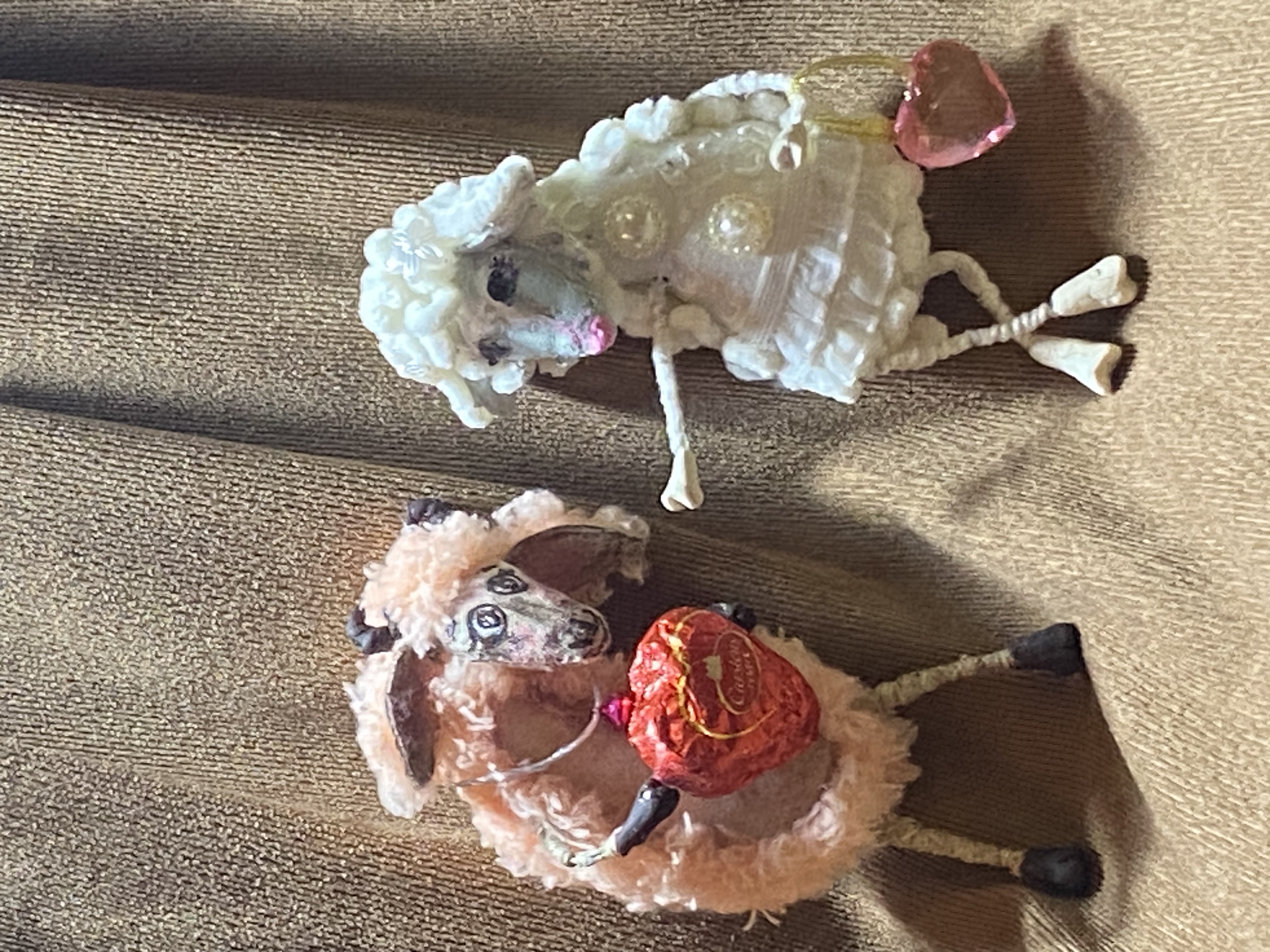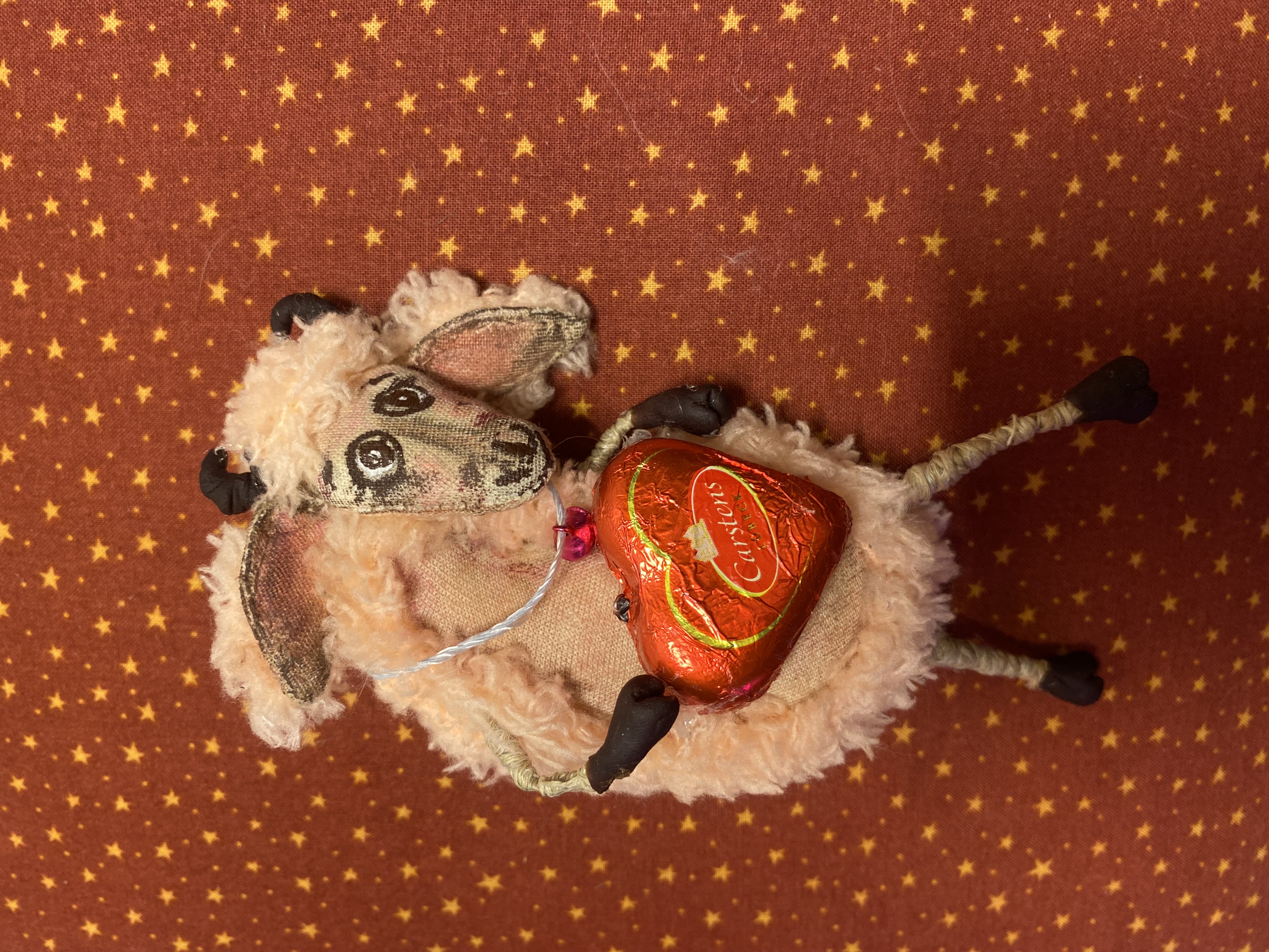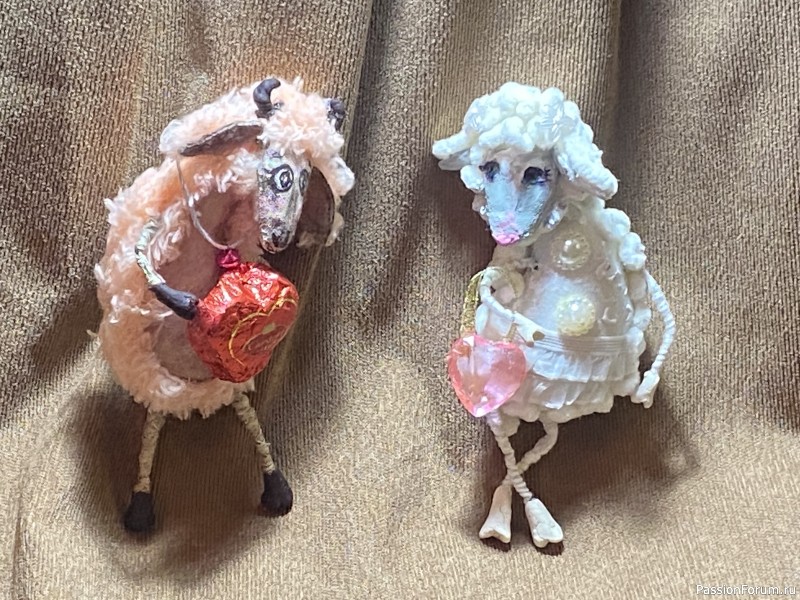 В порядке эксперимента решила сделать небольшого барашка. Только посмотрев на его мордочку, сразу же поняла, что он - влюблен! Срочно пришлось сотворить ему и объект его воздыханий! Поэтому родилась скромная беленькая овечка. Ну, и понятно, что радостный барашек потащил ей, крепенько зажав в копытцах, шоколадное сердечко.