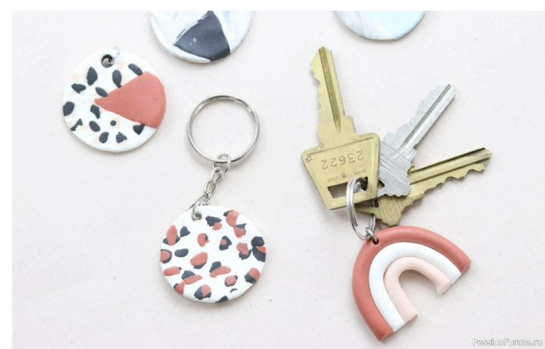 Запеките деталь согласно инструкции на упаковке глины. После того, как подвеска запечется и полностью остынет, с помощью плоскогубцев закрепите на ней соединительное кольцо, а также основу брелока.
