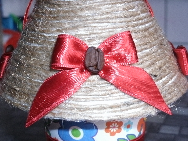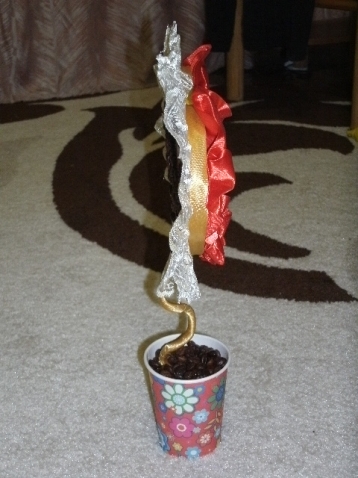 бобинка от пряжи обмотана дешевой толстой, но довольно красивой ниткой. Цветы из советской гофрированной бумаги.