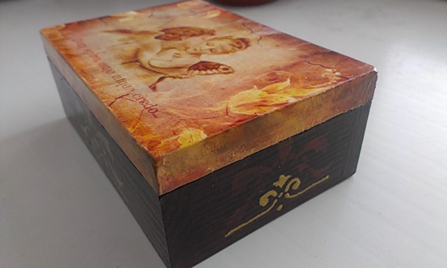 Хорошая шкатулка для первой работы. Но золотую окантовочку внутри я бы закрасила.