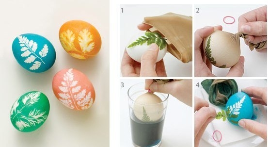 А вот так красили яйца наши бабушки. Прикладывали листик петрушки, обматывале марлей яйцо и варили в луковой шелухе. Но ведь тоже самое можно сделать и сейчас, но с ипользованием современных цветных красителей.