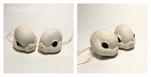 Я делала одновременно двух малышей. Вот они, уже с веками, смотрят — что будет дальше. Обратите внимание, что затылок у головок свалян рыхло для крепления ушек.