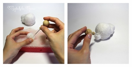 Берем равные части шерсти для формирования больших щечек под глазками. Лучше сначала свалять на губке шерсть в