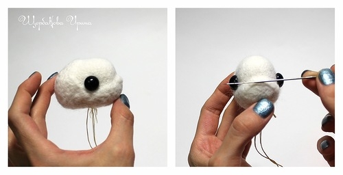 К полученной заготовке пришиваем глазки шнуром и выпускаем концы шнура так, чтобы они в последующем служили креплением головки.