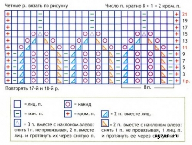 На спицы № 3,5 набрать 107 п. и связать 2 см плат, вязкой. Продолжить вязание спицами № 4 узором по схеме на протяжении 18 р. и затем повторять 17-й и 18-й р. На высоте 15 см от плат, вязки выполнить убавления след. образом: