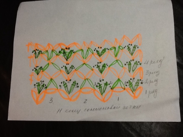 На схеме первый ряд не ровный ,но это только для рисунка на бумаге ,что бы можно было второй ряд нарисовать как он вывязывается на базе первого.Я начинала из 11 колец соломоновой сетки для детского платья