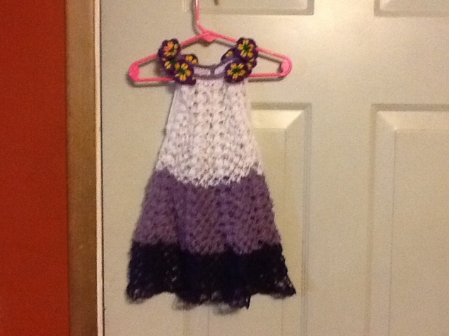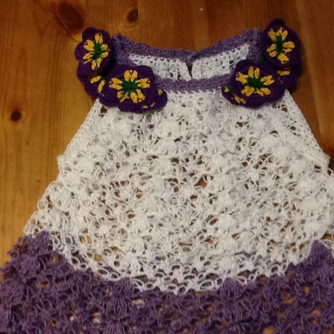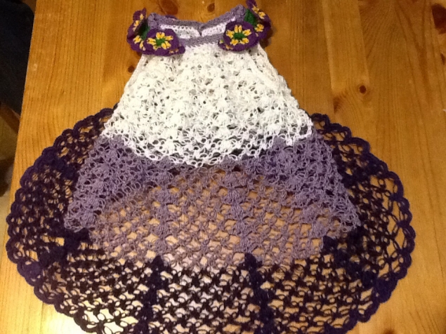 На линии плечиков и спинки для украшения связала фиалки ,я о них в моих топиках делала МК.Очень хочется помереть на Софию и посмотреть как она будет реагировать.Прошлого года платья она трогала ажур юбки пальчиками все время и тянула в рот,ей еще и года не было тогда. Теперь то мы подросли ,сумку Мики маус вешает на руку и бегает от собаки по всему дому,заколку на волосики можно приколоть ,зубы дает чистить без проблем и заворачиваем куклу -пупса в пеленку и укладываем в коляску.Растет будущая мамочка!.Даже не верится ,что так время летит.Вот кажется только мы увидели наше 2,5 килограмма счастья ,а уже словно Дюймовочка бегает по дому и лопочет "what is this?"