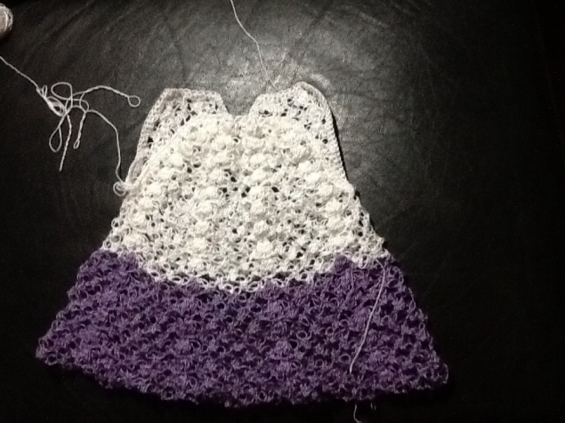 Собираемся в отпуск на Азовское море показать нашу малышку прабабушке и прадедушке и мне захотелось по схемам моего платья "Кардинал " повторить в масштабе для внучки сарафан.Теперь было вязать значительно легче учитывая весь опыт приобретенный с большим платьем.Цвет последней полосы фиолетовый,на фото смотрится как черный.
